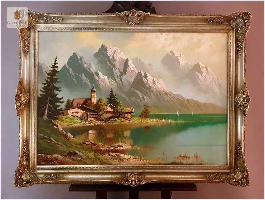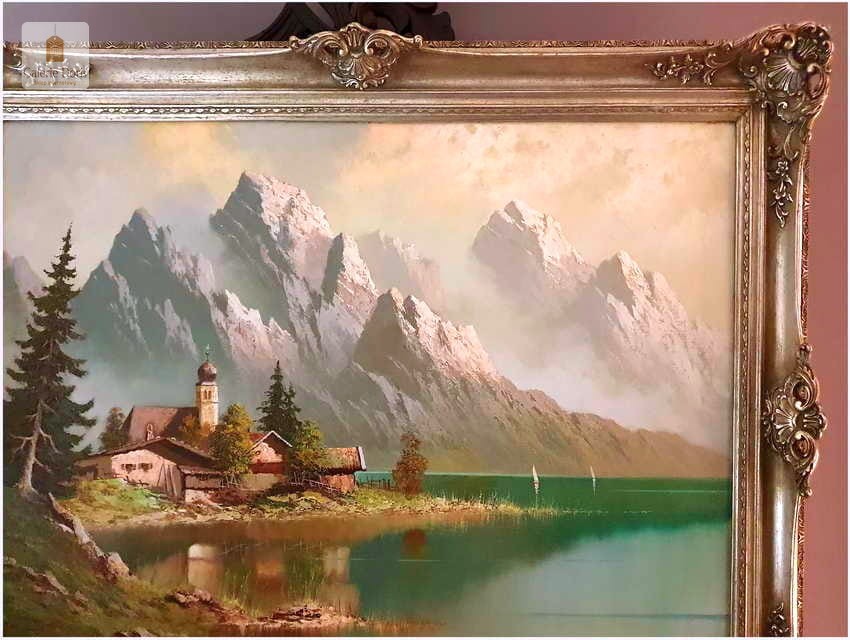 Polecamy duży wyjątkowo dekoracyjny obraz olejny na płótnie. Subtelnie malowany duży obraz olejny na płótnie. Wspaniale oddano partię nieba oraz rozległy widok na otaczające go góry. Turkusowa zieleń wody kontrastuje z pastelami nieba i górskich szczytów. Bardzo nastrojowa kompozycja. Oferta bez widocznej ramy!