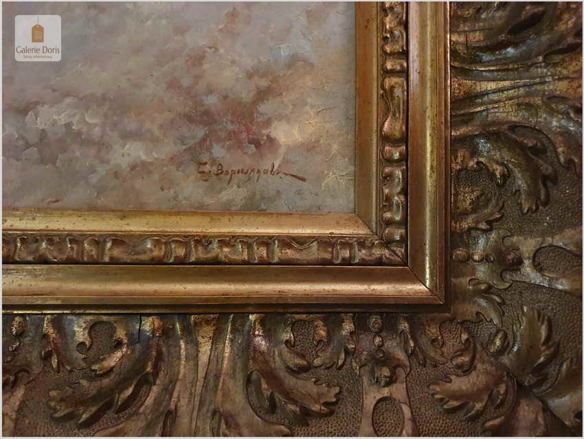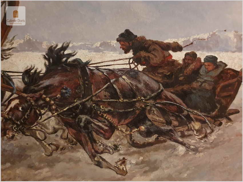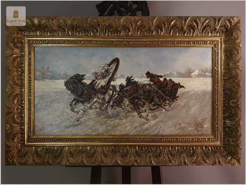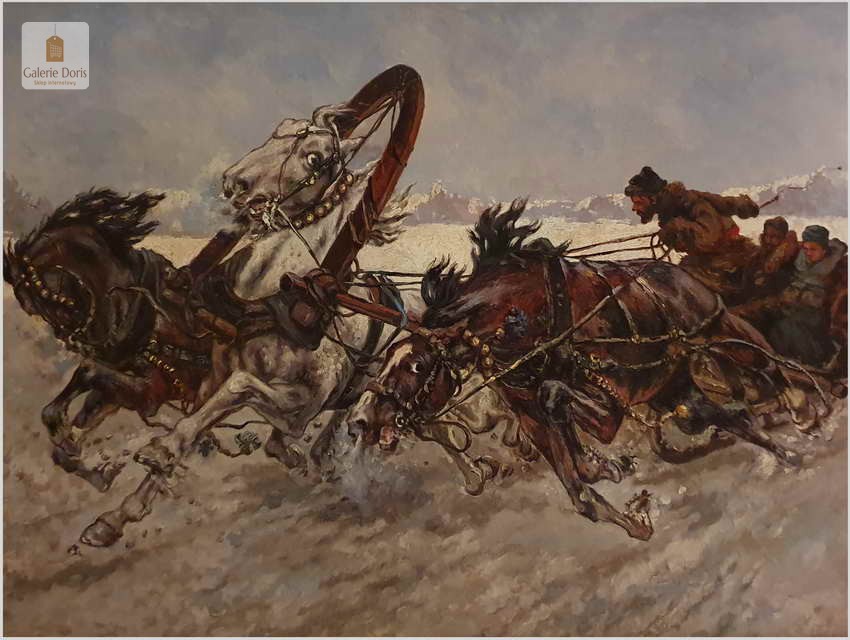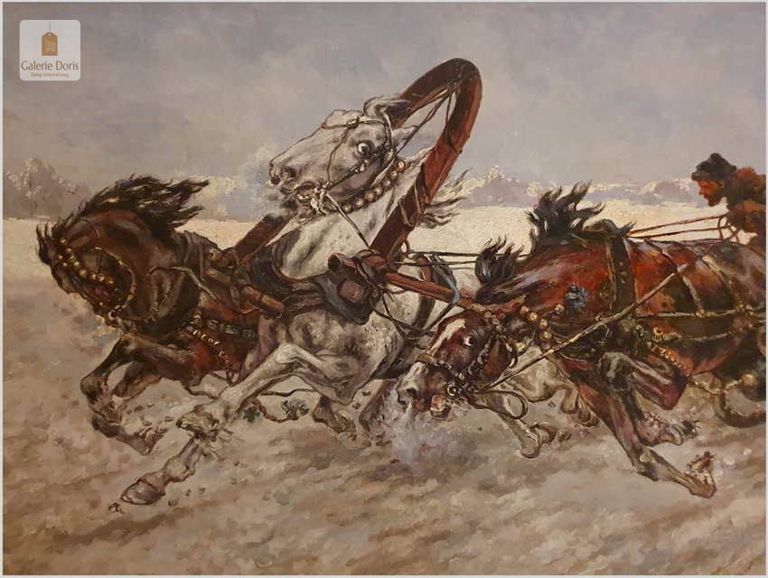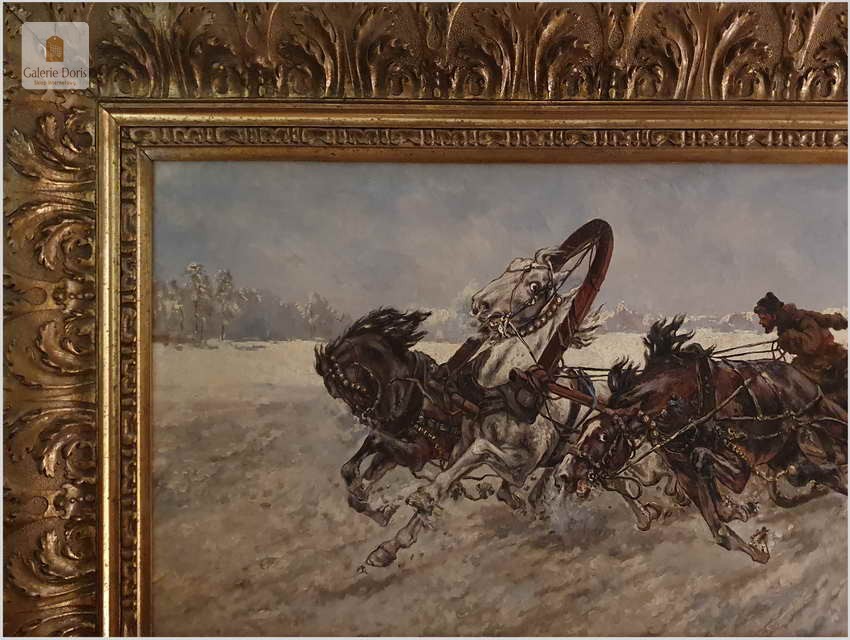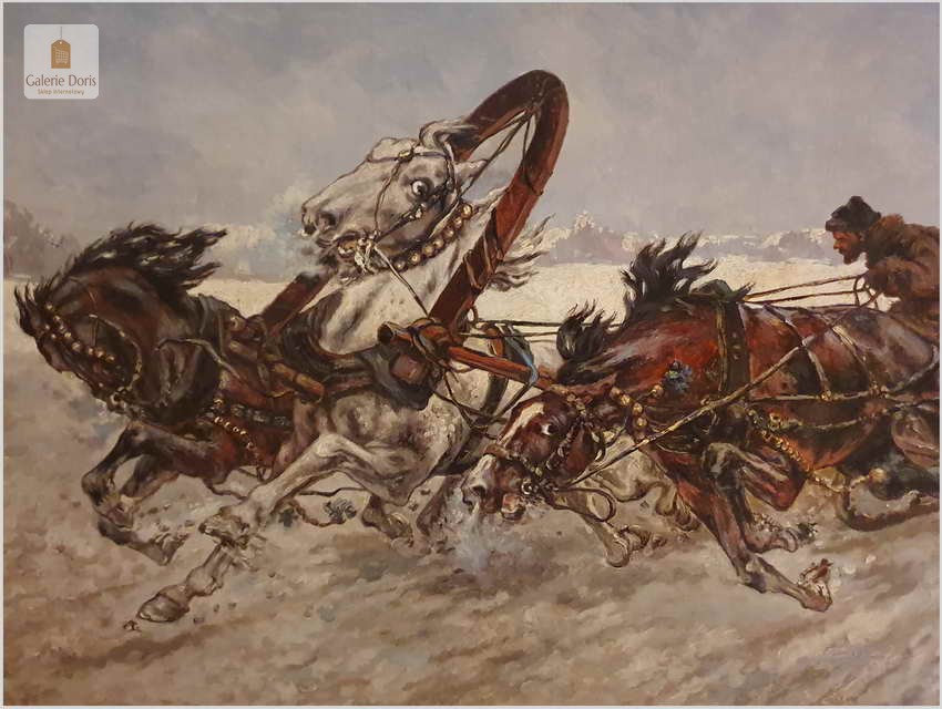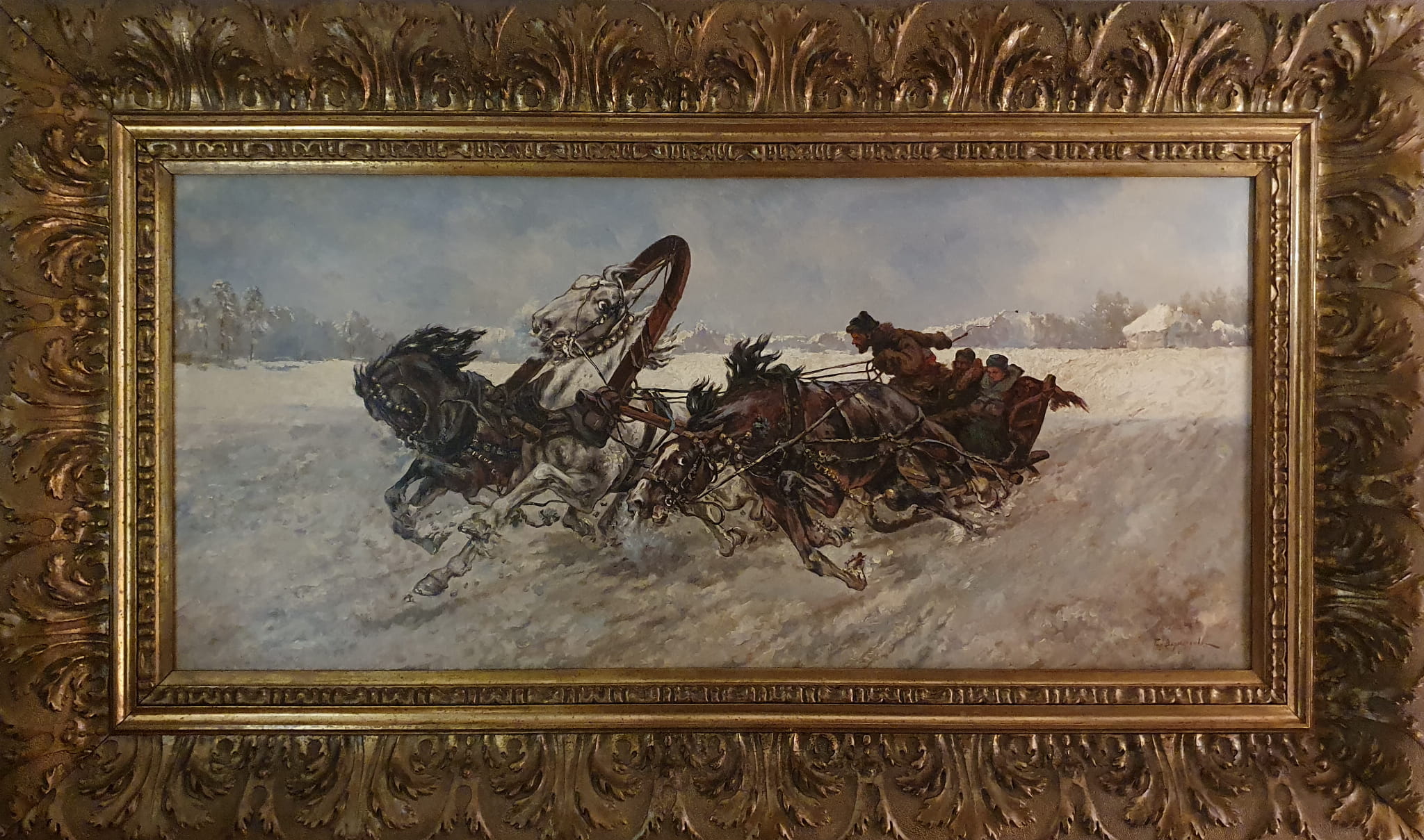 Zasługuje na uwagę rozmiar obrazu 150cm x 82cm, malarz doskonale posłużył się skrótem perspektywicznym przy tworzeniu sylwetek koni w zaprzęgu , czym rozbił schematyzm ujęcia „trójki”. Obraz sygnowany cyrylicą w prawym dolnym rogu płótna - Polecamy!