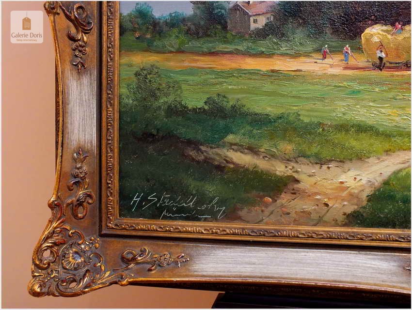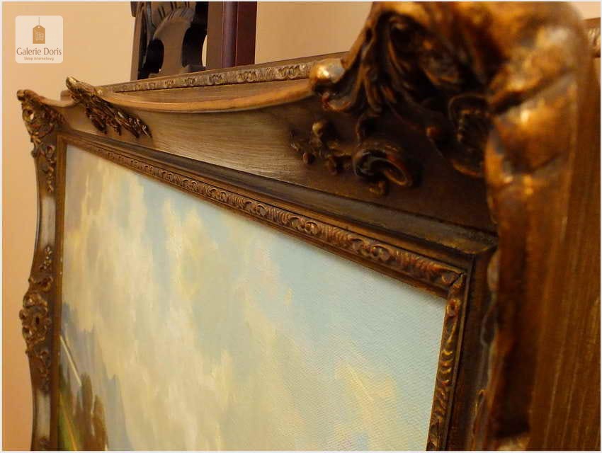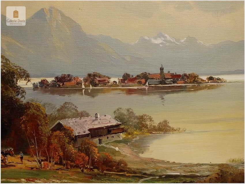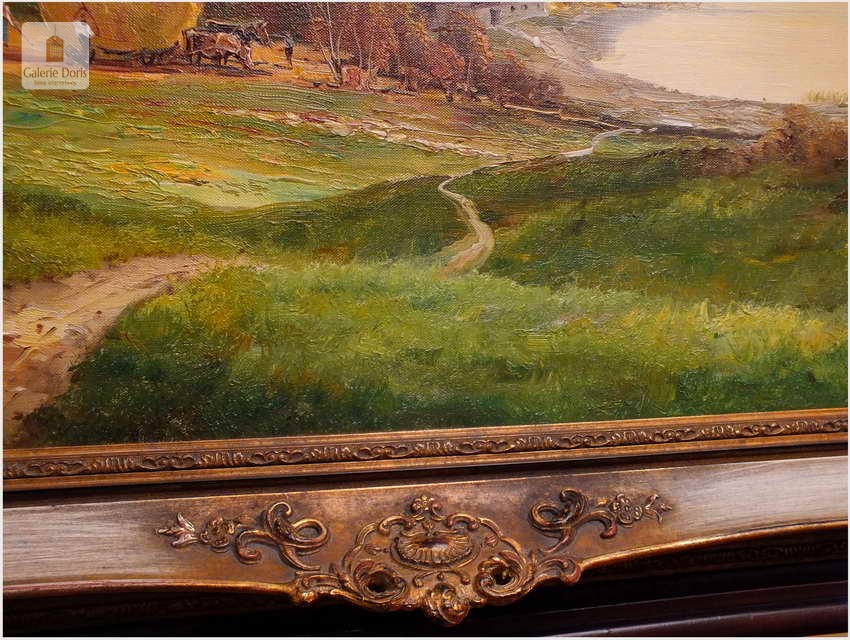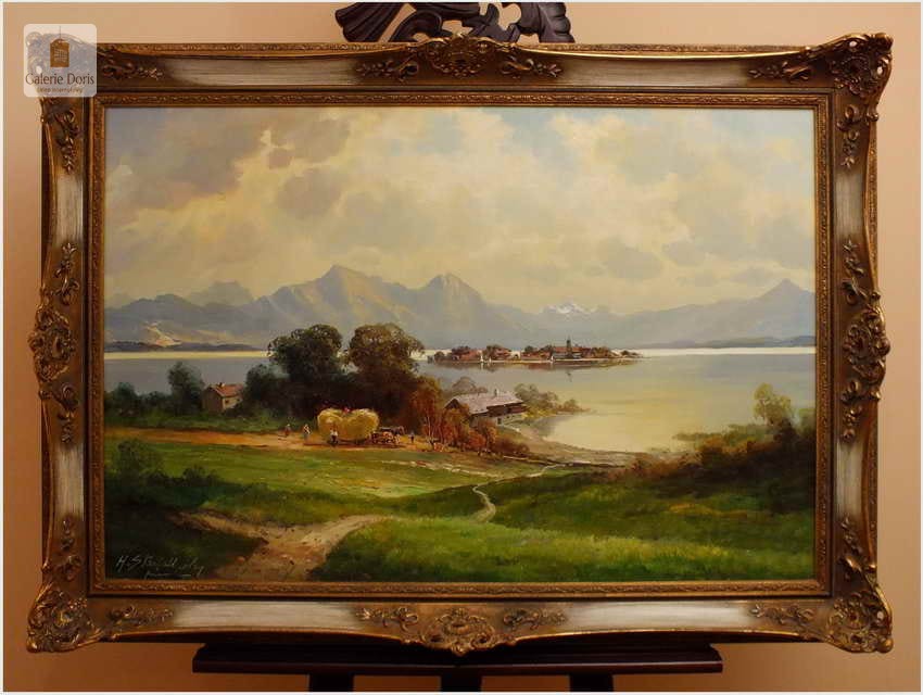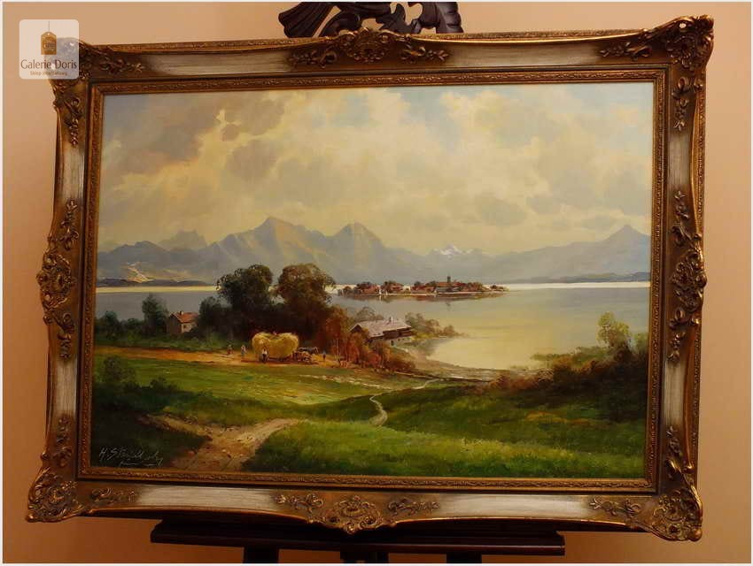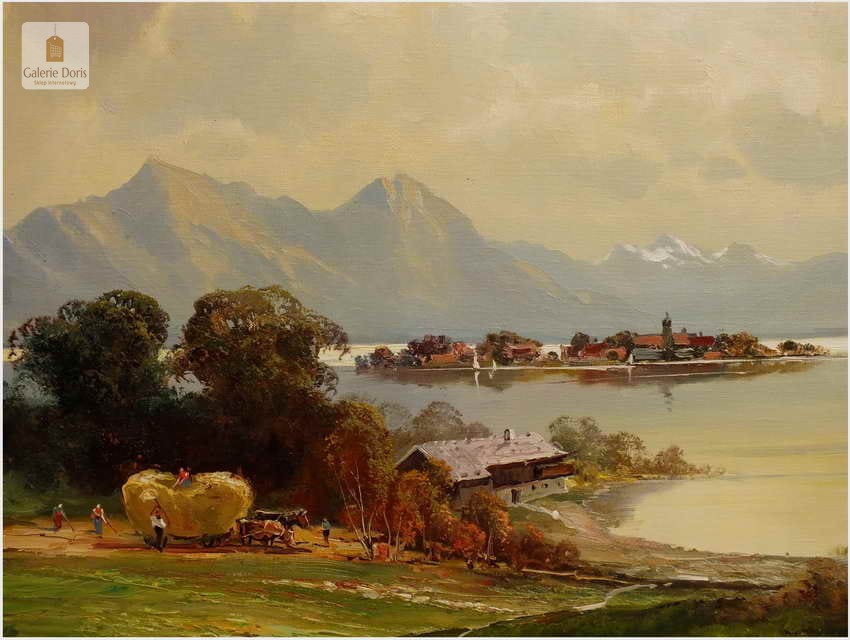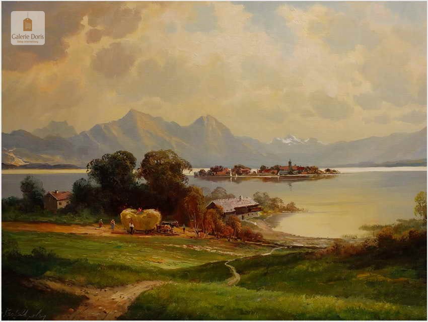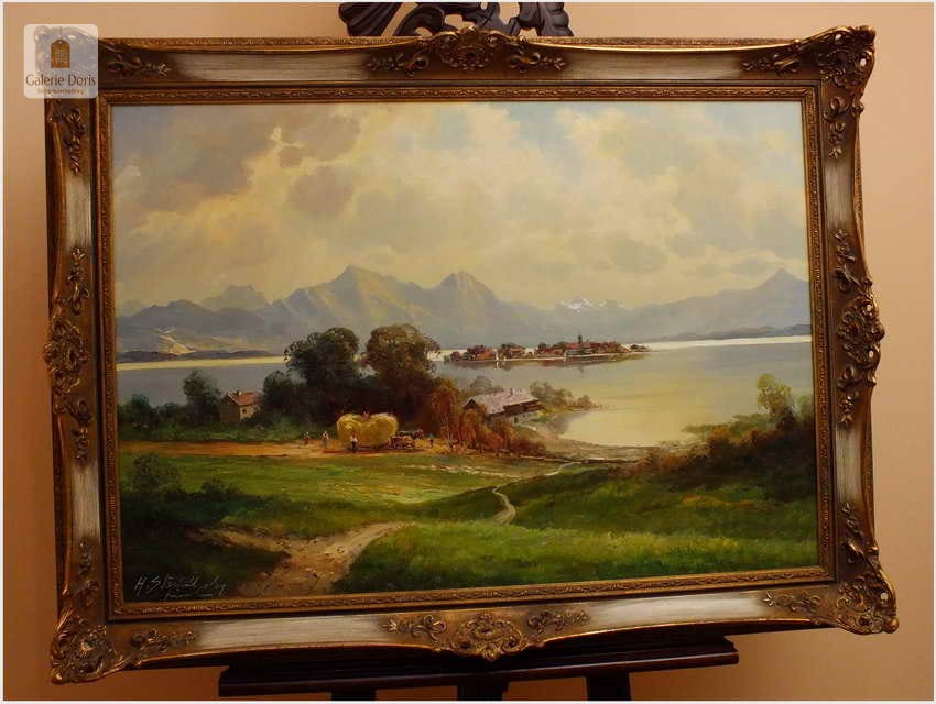 Niezwykle piękny, romantyczny krajobraz, przedstawiający malowniczo położoną dolinę koło Chiemsse z charakterystyczną wyspą, to subtelnie malowany obraz olejny na płótnie. Wspaniale oddano partię nieba oraz rozległy widok na horyzont i otaczające go góry. Soczysta zieleń majestatycznej roślinności kontrastuje z pastelami nieba i górskich szczytów. Obraz przedstawia sianokosy, nastrojowa kompozycja. Ten relaksujący duży pejzaż odznacza się delikatnie prowadzonymi liniami pędzla i wysmakowaną grą barw. Cechuje go świetna technika malarska. Powierzchnię obrazu pokrywa warstwa satynowego werniksu. Obraz oprawiony jest w przestrzenną, grubą ramę wykonaną z drewna. Złoconą ramę ozdabiają misterne sztukaterie. Stan obrazu oraz ramy b.dobry - do obrazu dołączamy certyfikat - Polecamy!.