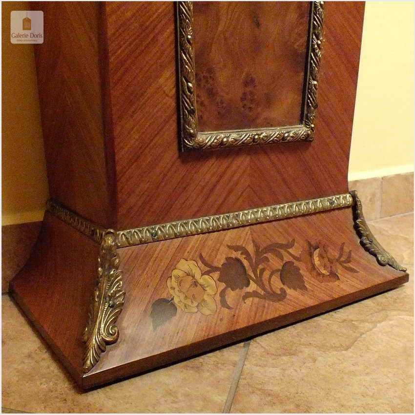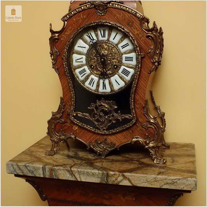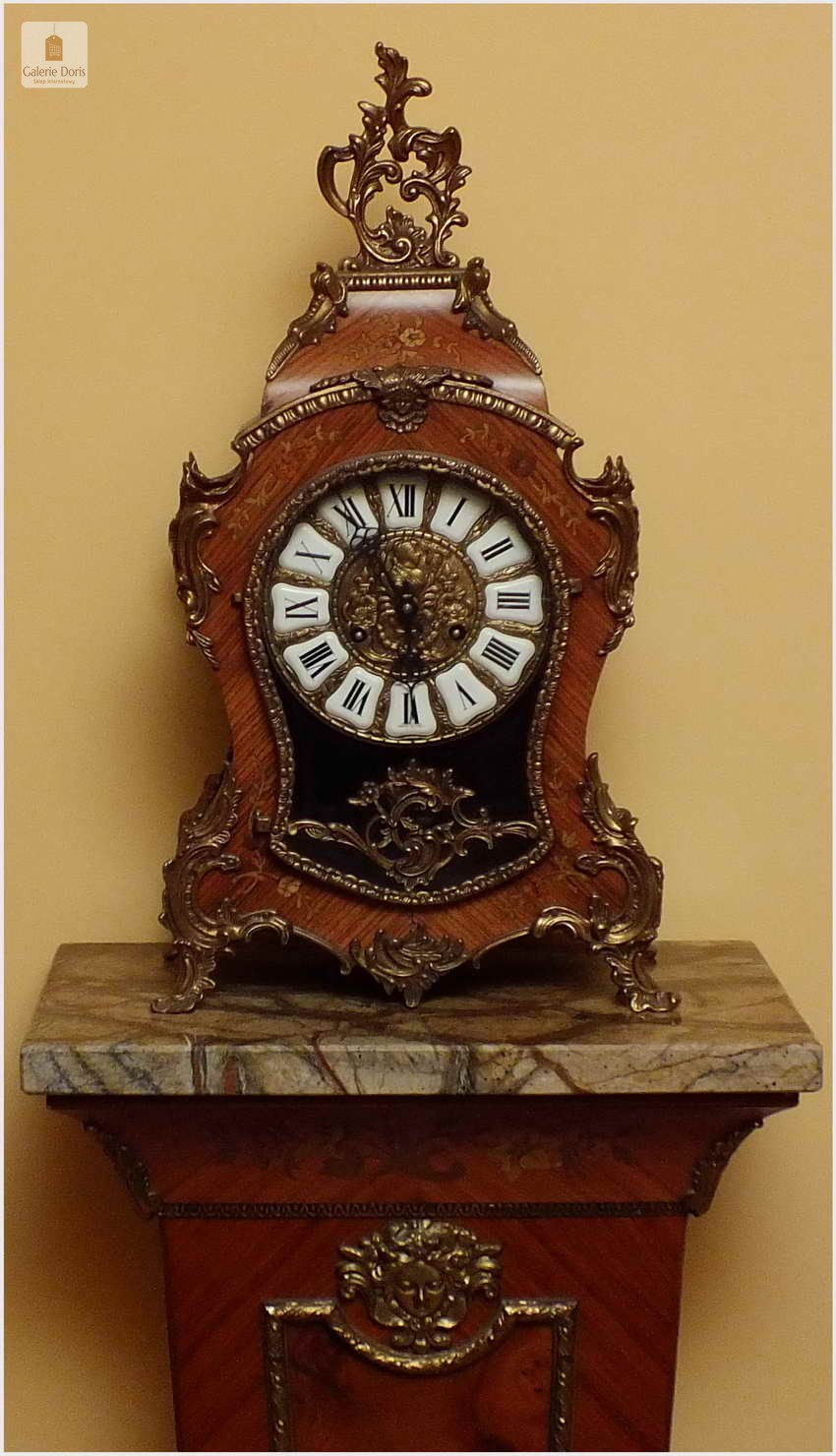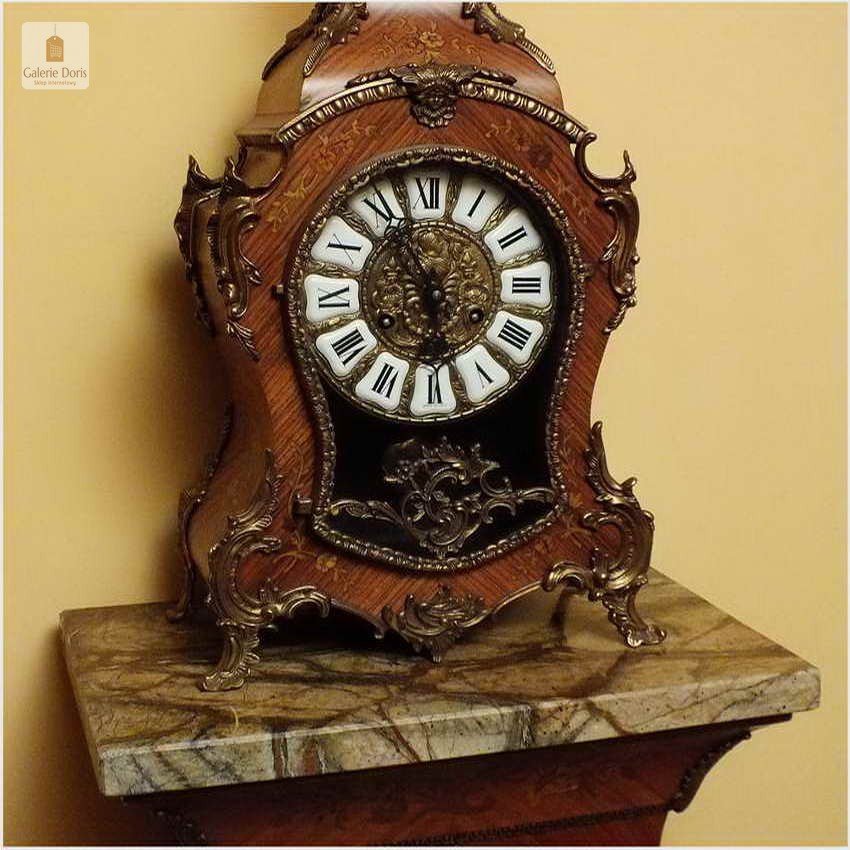 Przedmiotem sprzedaży jest duży zegar w stylu Charles André Boulle z konsolą podłogową wykonaną z drewna z aplikacjami z brązu i marmuru. Drewniana obudowa zegara wsparta na czterech wygiętych nóżkach z brązu, zwieńczona floralną aplikacją - brąz. Tarcza zegarowa okrągła, dekorowana reliefowym ornamentem, z emaliowanymi płytkami z rzymskim oznaczeniem godzin. Boczne ornamenty wtapiane z płytek mosiężnych. Wahadło w kształcie koła - mosiężne. Mechanizm z systemem bicia godzin i półgodzin (dwa młoteczki uderzają w dwa dzwonki dwu tonowo), regulator wahadłowy, Mechanizm zegara FHS Hermle- w pełni sprawny, system bicia godzin i półgodzin, chodzi 6-8 dni. Polecamy ten zegar jak z bajki. Zegar w stylu Charlesa Boulle wykonany w II połowie ubiegłego wieku - Bez zbędnych dodatkowych kosztów - rozpakowujesz i używasz ciesząc oko z dobrego wyboru. Mechanizm sprawny po przeglądzie u naszego zegarmistrza. Wszystkie elementy dekoracyjne z brązu.