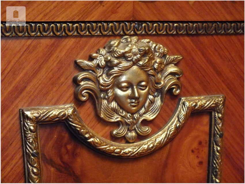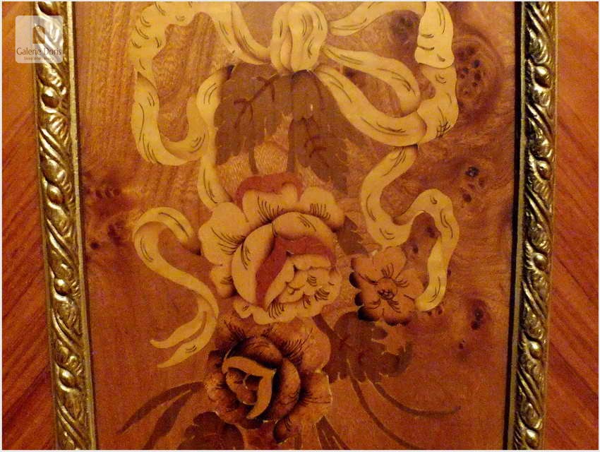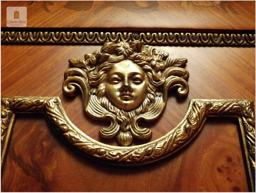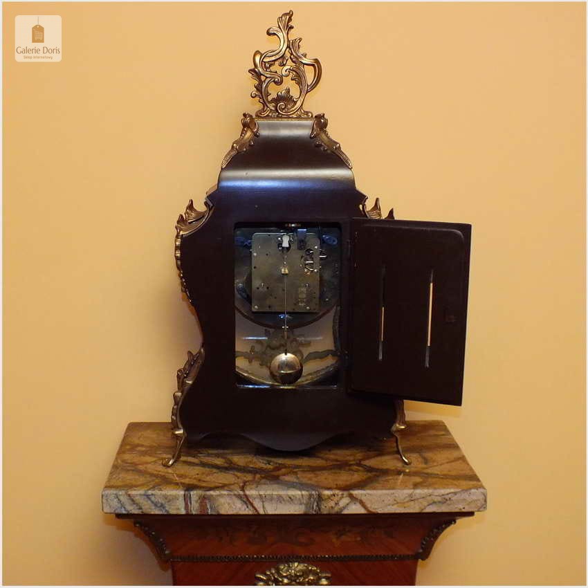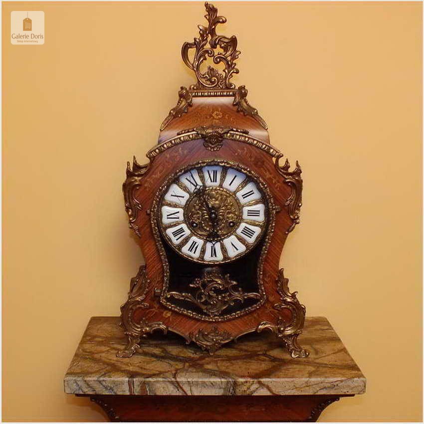 Przedmiotem sprzedaży jest duży zegar w stylu Charles André Boulle z konsolą podłogową wykonaną z drewna z aplikacjami z brązu i marmuru. Drewniana obudowa zegara wsparta na czterech wygiętych nóżkach z brązu, zwieńczona floralną aplikacją - brąz. Tarcza zegarowa okrągła, dekorowana reliefowym ornamentem, z emaliowanymi płytkami z rzymskim oznaczeniem godzin. Boczne ornamenty wtapiane z płytek mosiężnych. Wahadło w kształcie koła - mosiężne. Mechanizm z systemem bicia godzin i półgodzin (dwa młoteczki uderzają w dwa dzwonki dwu tonowo), regulator wahadłowy, Mechanizm zegara FHS Hermle- w pełni sprawny, system bicia godzin i półgodzin, chodzi 6-8 dni. Polecamy ten zegar jak z bajki. Zegar w stylu Charlesa Boulle wykonany w II połowie ubiegłego wieku - Bez zbędnych dodatkowych kosztów - rozpakowujesz i używasz ciesząc oko z dobrego wyboru. Mechanizm sprawny po przeglądzie u naszego zegarmistrza. Wszystkie elementy dekoracyjne z brązu.