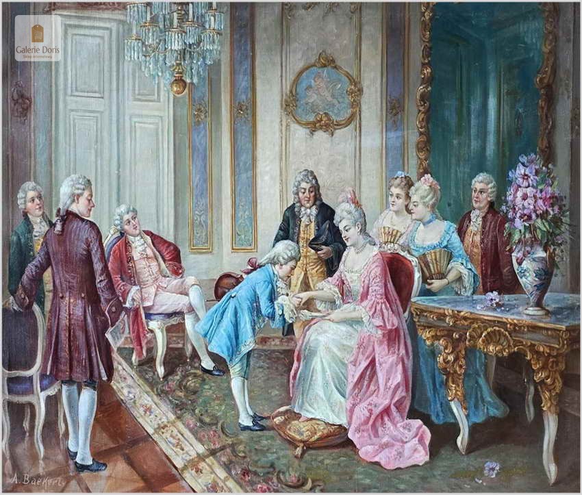 Obraz autorstwa A. Baekerta (malarza z XIX wieku, specjalizującego się w scenach salonowych/rokokowych) przedstawia elegancką scenę rodzajową z życia wyższych sfer, utrzymaną w stylistyce nawiązującej do XVIII-wiecznego rokoka. Centralną częścią obrazu jest grupa postaci zebranych w bogato urządzonej, dużej sali. Postacie są rozmieszczone dynamicznie, tworząc rodzaj salonowego spotkania. W centralnym punkcie, lekko na prawo, widzimy elegancką damę w długiej, różowej sukni, siedzącą na niskim krześle. Wygląda, jakby miała czytać list lub inny dokument, na którym skupia uwagę. Przed nią pochyla się młody mężczyzna w jasnoniebieskim stroju, składając ukłon i całując jej dłoń. To gest typowy dla dworskiej galanterii. Scena rozgrywa się w przestronnym, bogato urządzonym salonie. Na suficie wisi duży, ozdobny żyrandol z kryształowymi elementami. Ściany są udekorowane panelami, tapetami lub malowidłami w pastelowych odcieniach, z dekoracyjnymi sztukateriami. W głębi po prawej stronie widać duże lustro lub przejście do innej komnaty z bogato zdobioną zasłoną w kolorze turkusowym. Na podłodze leży duży, ozdobny dywan z kwiatowymi wzorami. Obraz charakteryzuje się jasną, pastelową paletą barw, typową dla rokoka, z dominacją błękitów, różów, bieli, złota i zieleni. Światło jest miękkie i rozproszone, podkreślające elegancję sceny i delikatność postaci.