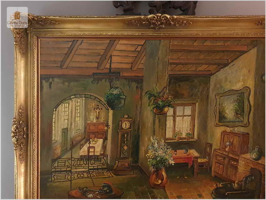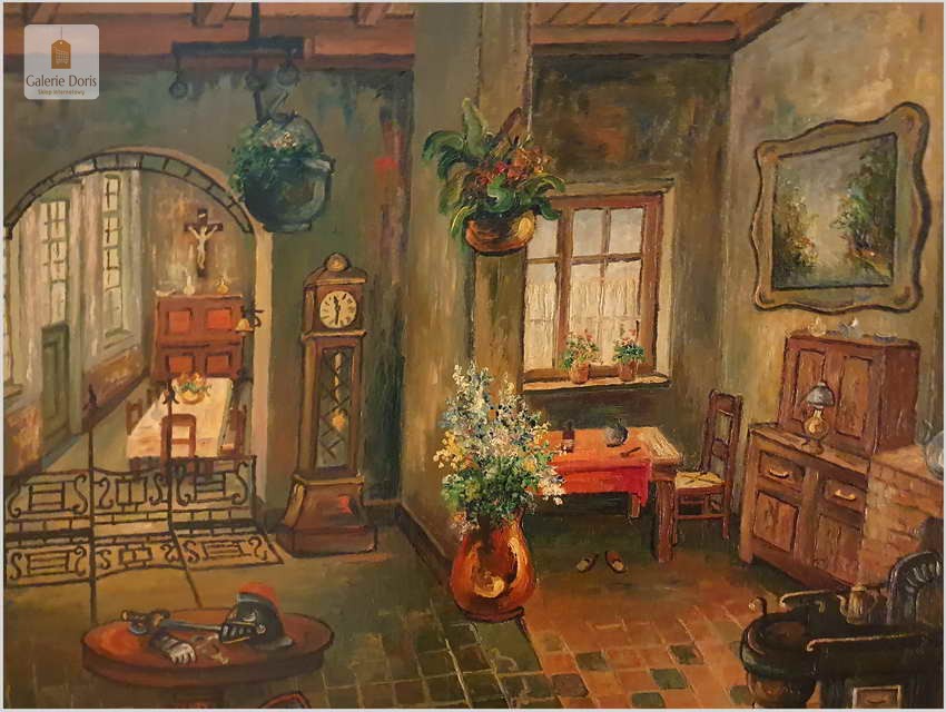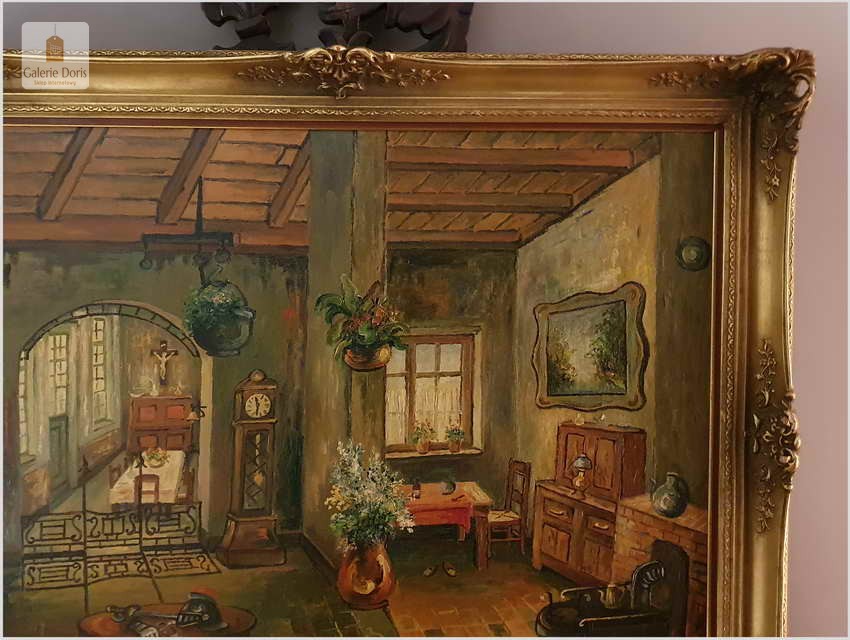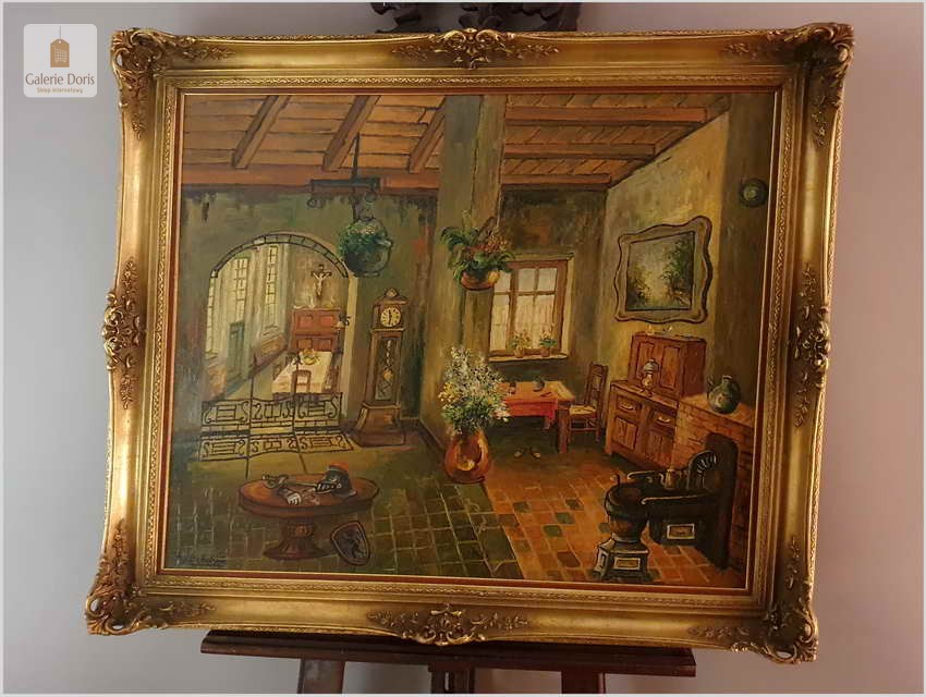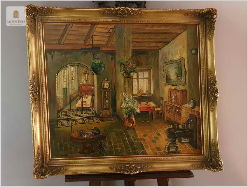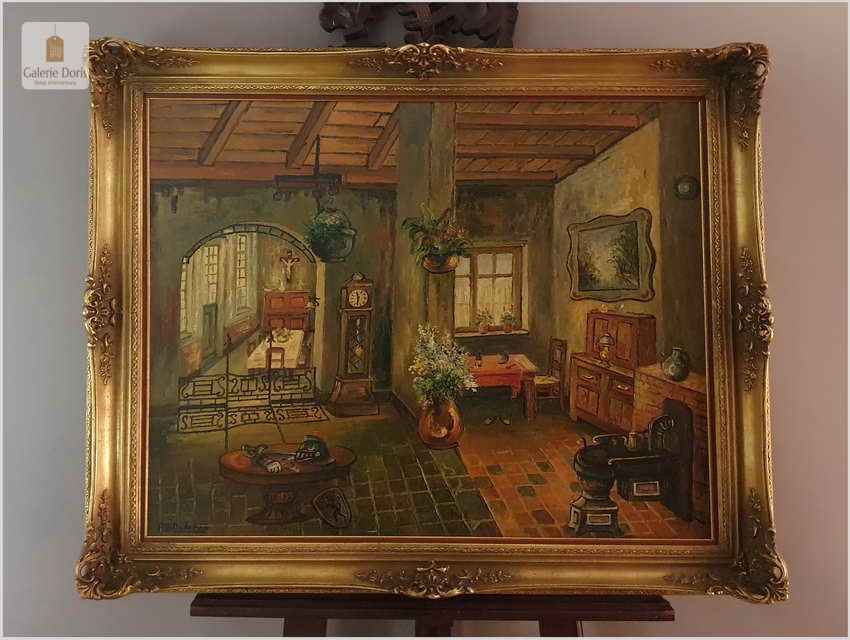 Proponujemy Państwu wyjątkowy stary obraz olejny o rzadko spotykanej tematyce, belgijskiego malarza wnętrz. Uprawiał on malarstwo fakturalne i sztalugowe, jego odbiorcami byli głównie mieszkańcy Balgii oraz zachodniej Francji. Jego obraz możemy spotkać przede wszystkim w Bibliotecznych wnętrzach dużych salonach, jadalniach. Proponowany obraz sprzedajemy bez ramy, będzie się wspaniale komponował w starych pomieszczeniach wśród stylowo urządzonych wnętrzach.
