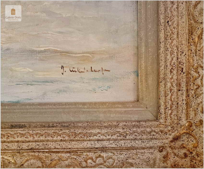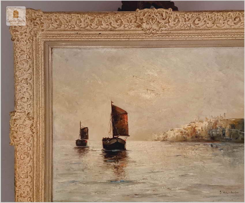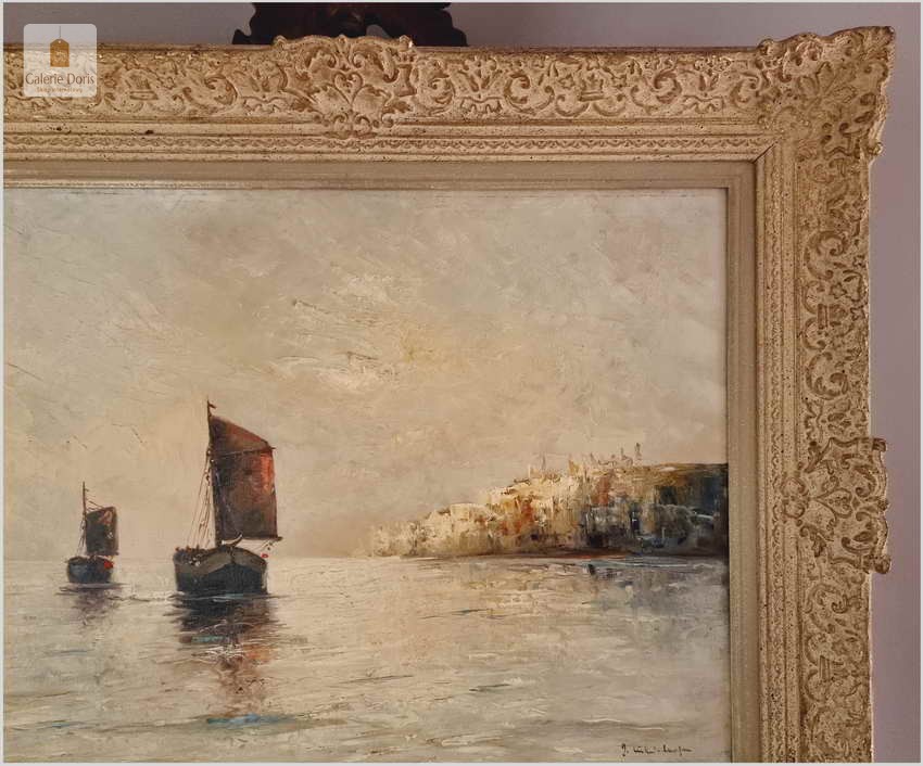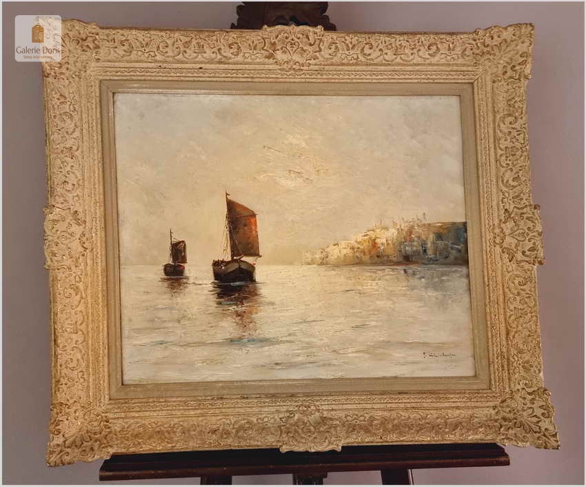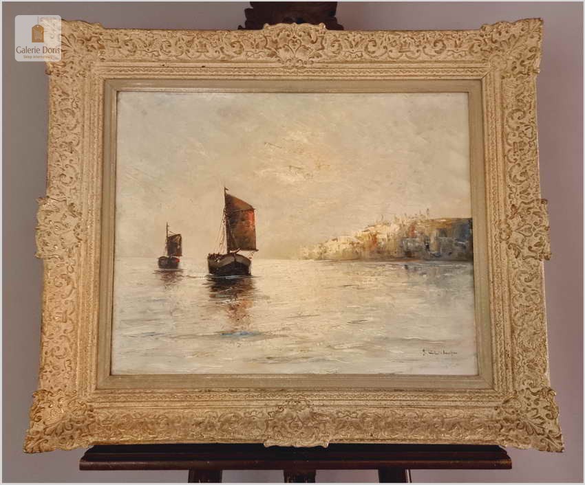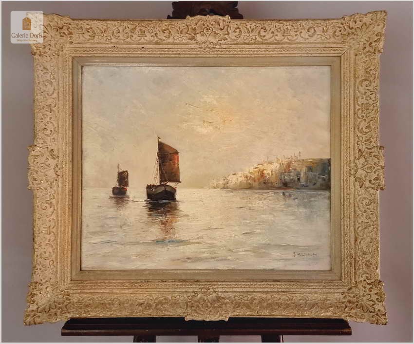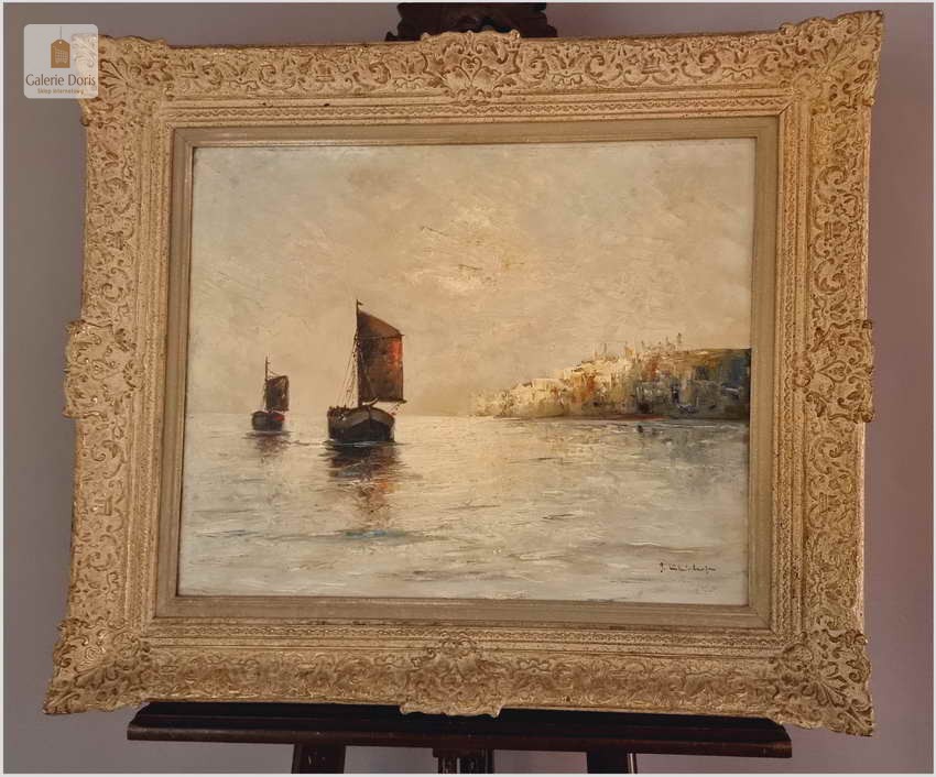 Typowy dla artysty motyw kutrów żaglowych ukazywanych przy brzegu, na redzie i w morzu. W tym przypadku przedstawiono łodzie w kimacie śródziemnomorskim. Obraz malowany mocnymi, odważnymi pociągnięciami pędzla bardzo dekoracyjny pejzaż morski. Polecamy!