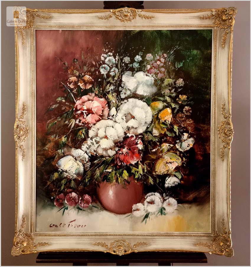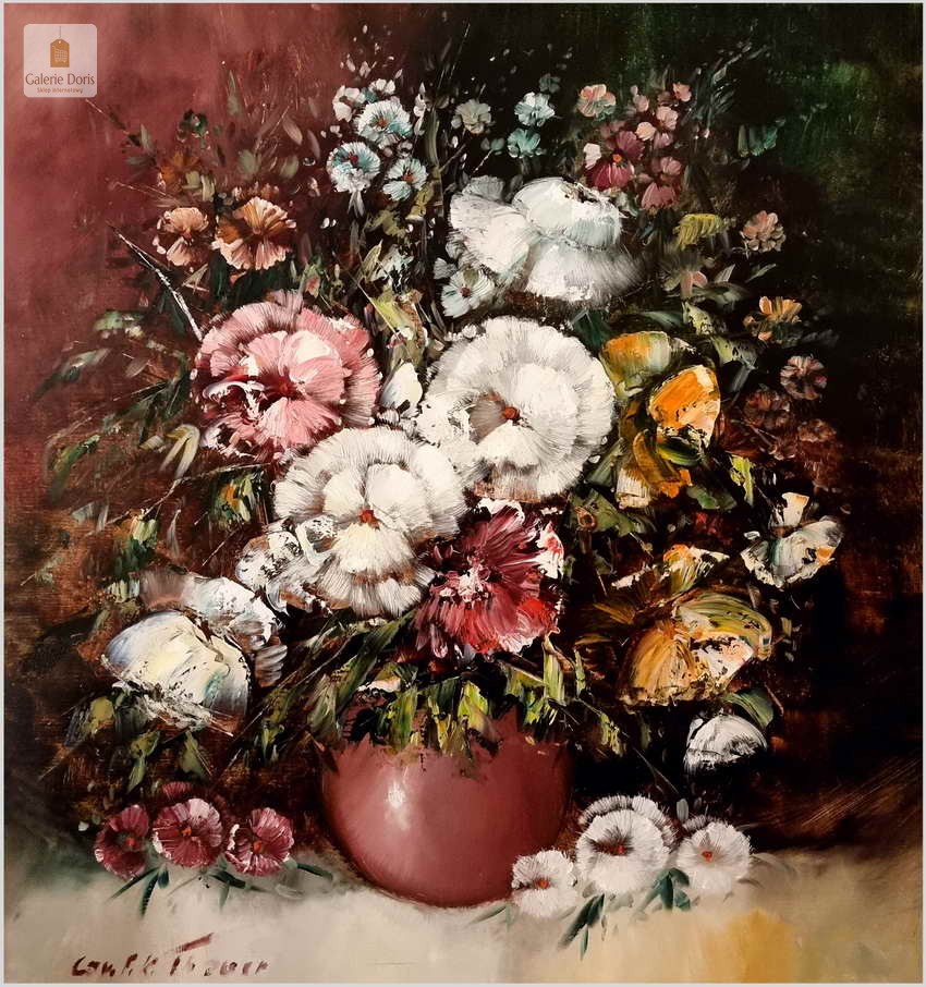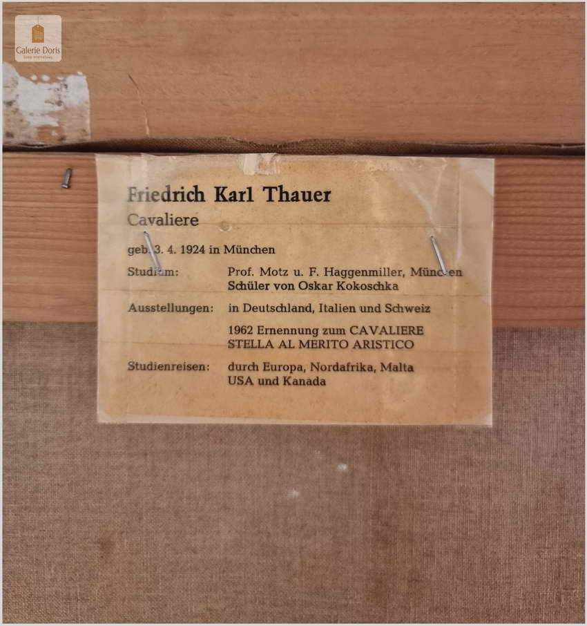 Friedrich Karl Thauer (03.04.1924 bis 20.01.2009).Niemiecki malarz kwiatów i pejzaży. W tym obrazie można się naprawdę zauroczyć, prezentuje się bardzo elegancko. Ma ładną kolorystykę, bardzo dobre wykonanie. Friedrich Karl Thauer 1924 - 2009 malarz niemiecki wywodzący się z rodziny artystów . Jego ojciec Heinrich był uczniem bardzo znanego malarza Rotha. F K Thauer studiował w Monachium u Franza Hagge Millera ,następnie u Oskara Kokoschka w Salzburgu w Austrii. Wielki sukces odniósł na galerii w Zurichu w Szwajcarii. Jego prace można znaleźć w wielu galeriach i aukcjach. Tylko w domach aukcyjnych Artprice wystawiano jego 130 prac, co świadczy o wielkiej popularności o popycie na jego sztukę.