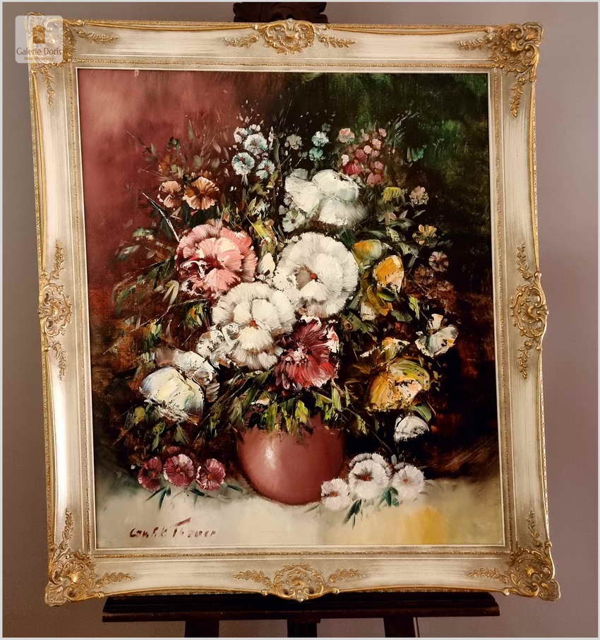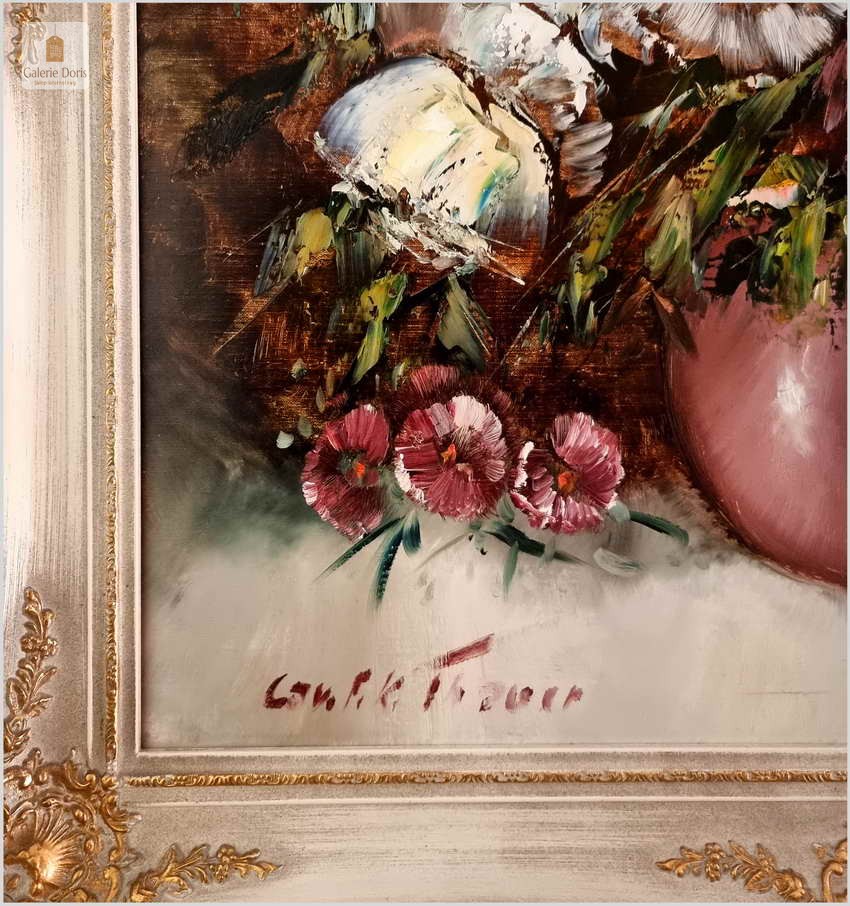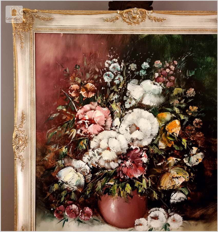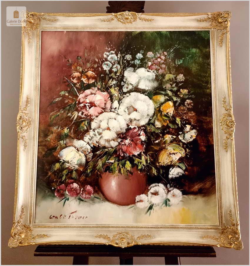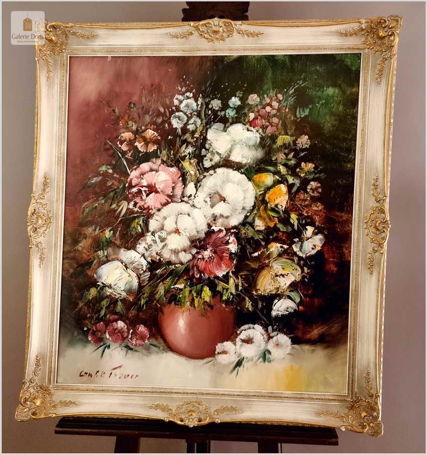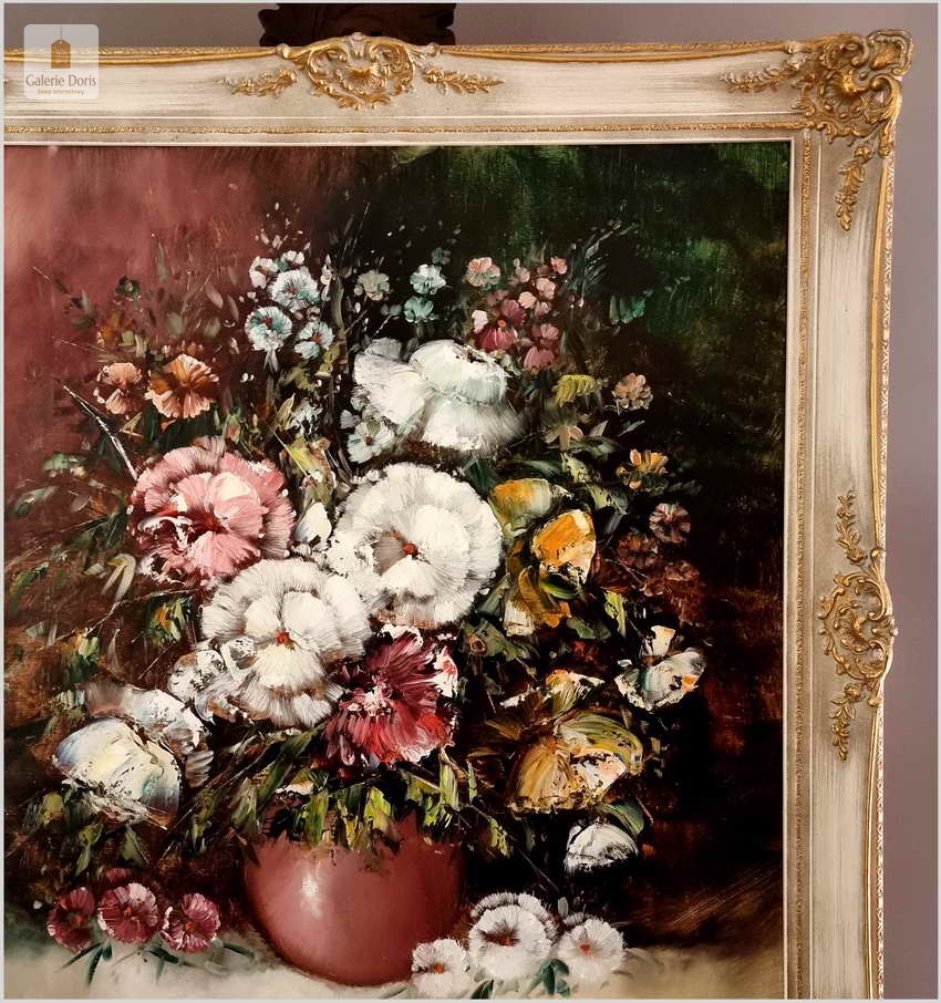 Obraz w bardzo dobrym stanie wizualnym i technicznym. Zachwycająco oddał plastyczność kwiatów, całość podkreślona została finezyjnymi efektami światłocieniowymi a także wyśmienitą grą niuansów barwnych. Ten subtelnie malowany obraz cechuje znakomita technika malarska. Oprawę malowidła stanowi przestrzenna, gruba rama wykonana z drewna. Złoconą ramę bogato dekorują kunsztowne sztukaterie. Gwarantujemy profesjonalnie zabezpieczoną przesyłkę kurierem.