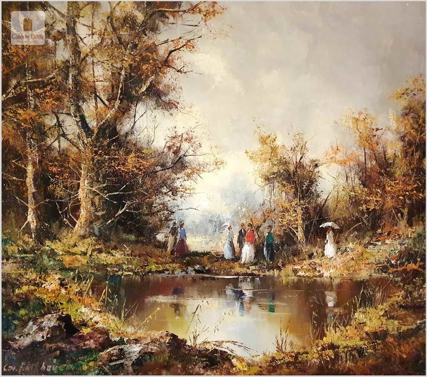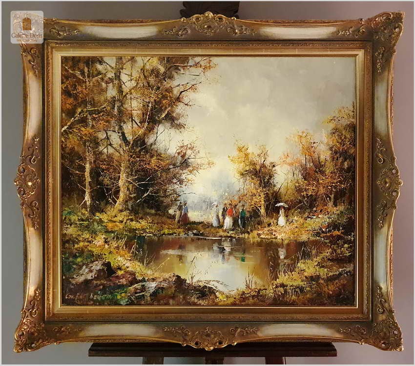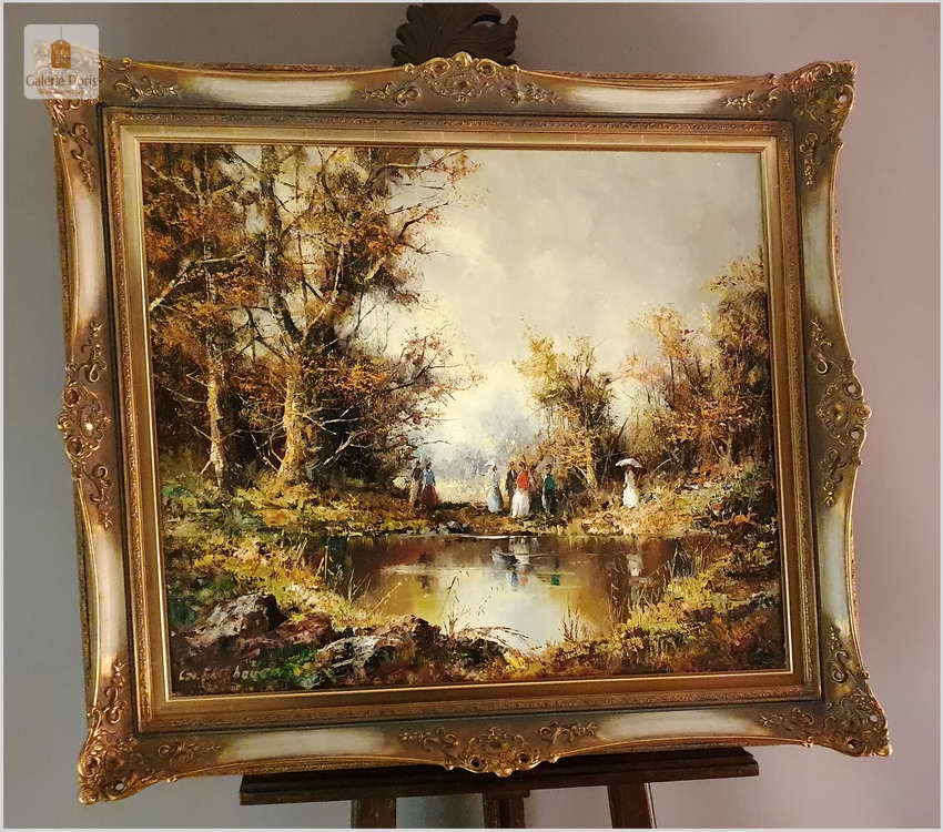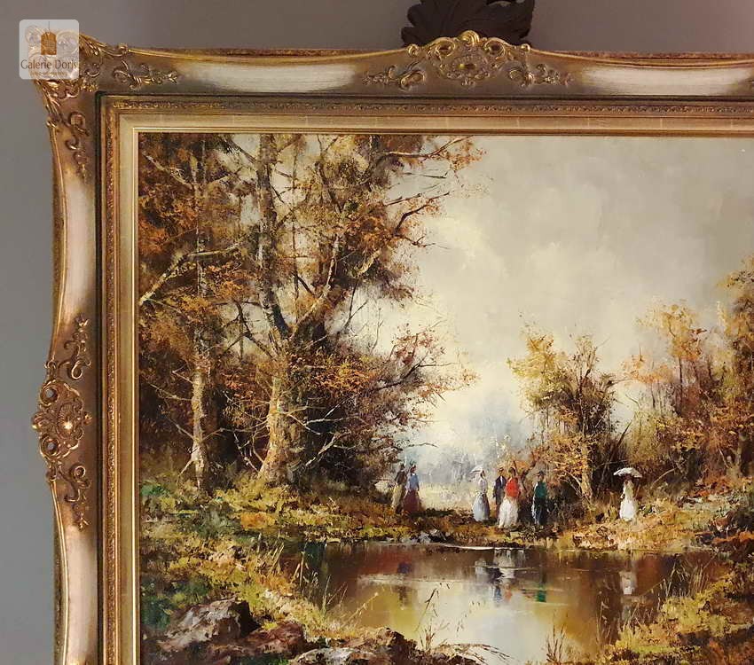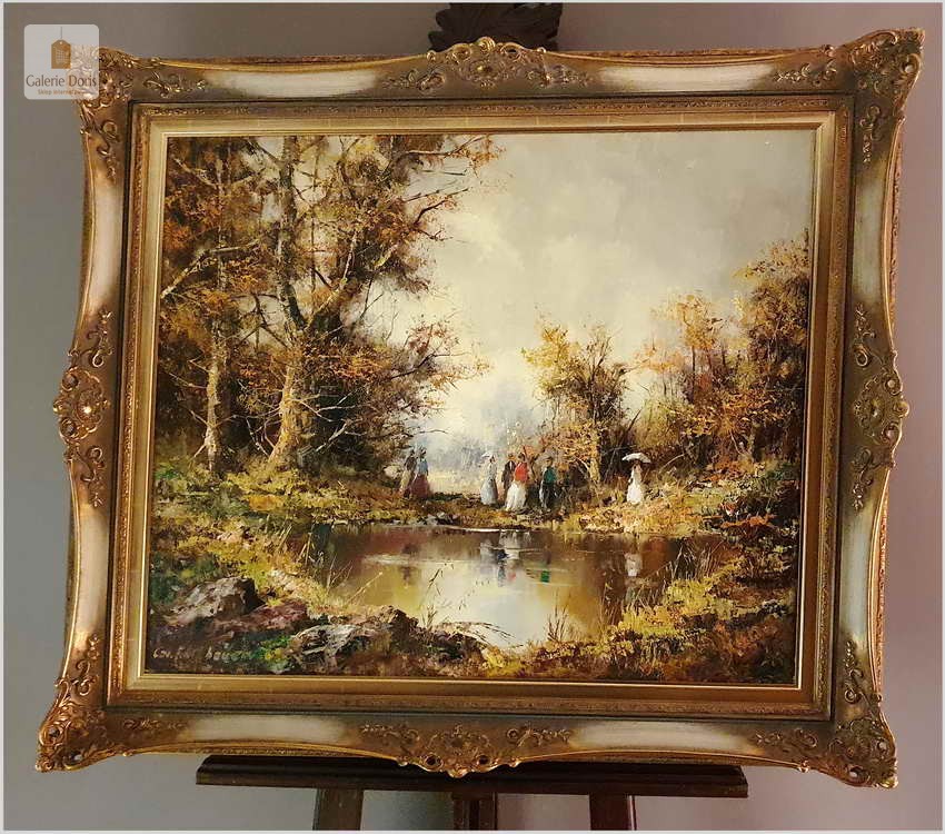 Obraz w bardzo dobrym stanie wizualnym i technicznym. Zachwycająco oddał plastyczność malowanego otoczenia, całość podkreślona została finezyjnymi efektami światłocieniowymi a także wyśmienitą grą niuansów barwnych. Ten subtelnie malowany obraz cechuje znakomita technika malarska. Oprawę malowidła stanowi przestrzenna, gruba rama wykonana z drewna. Złoconą ramę bogato dekorują kunsztowne sztukaterie. Gwarantujemy profesjonalnie zabezpieczoną przesyłkę kurierem.