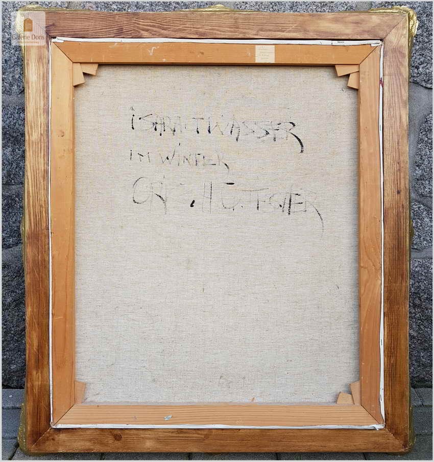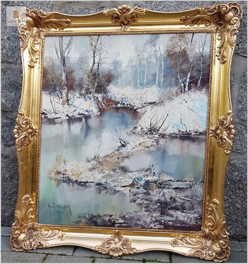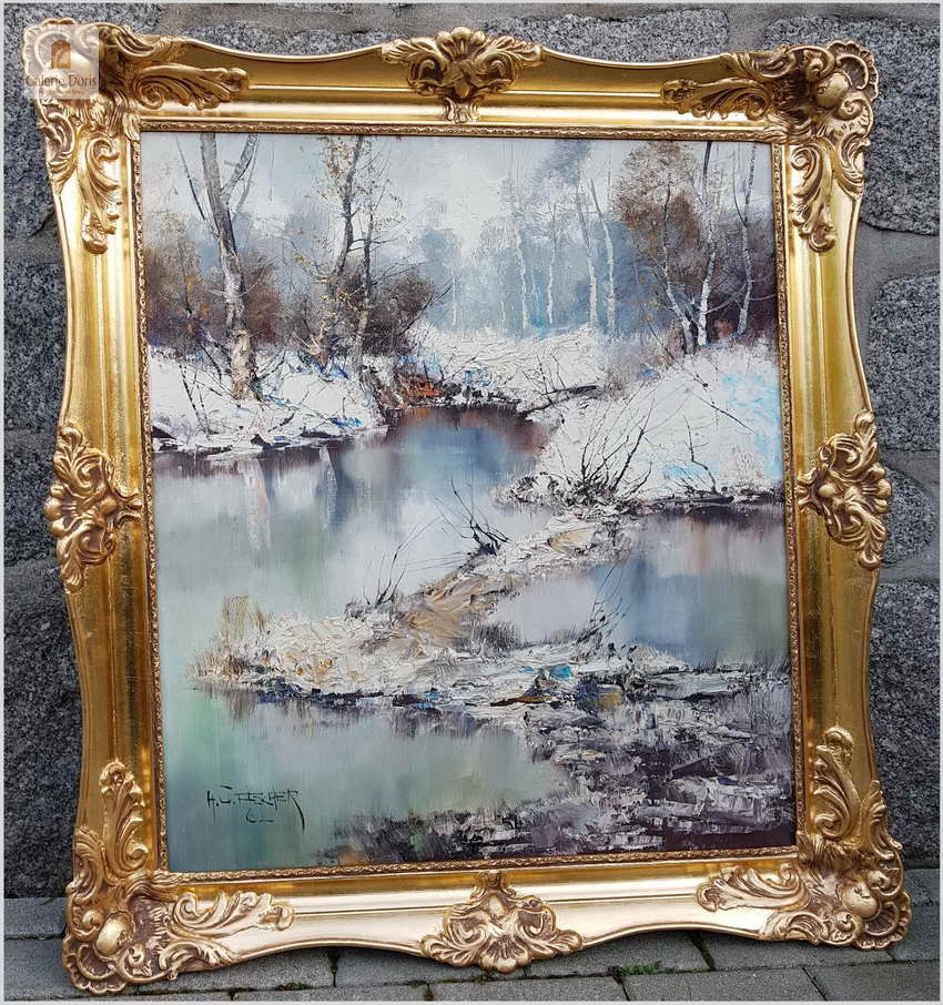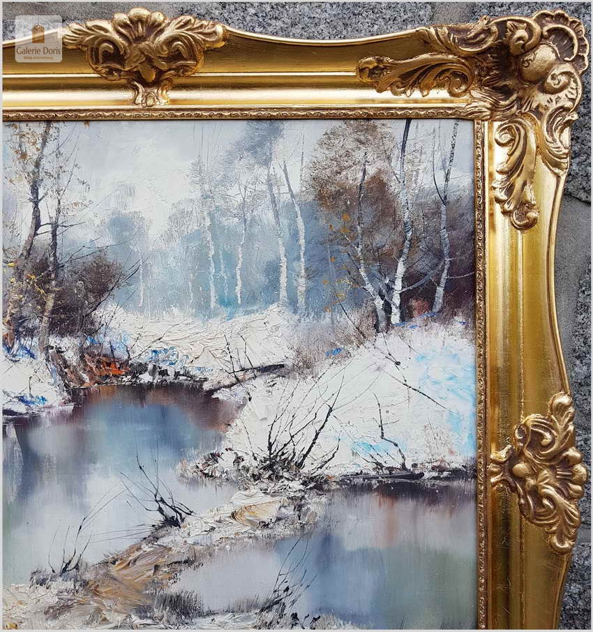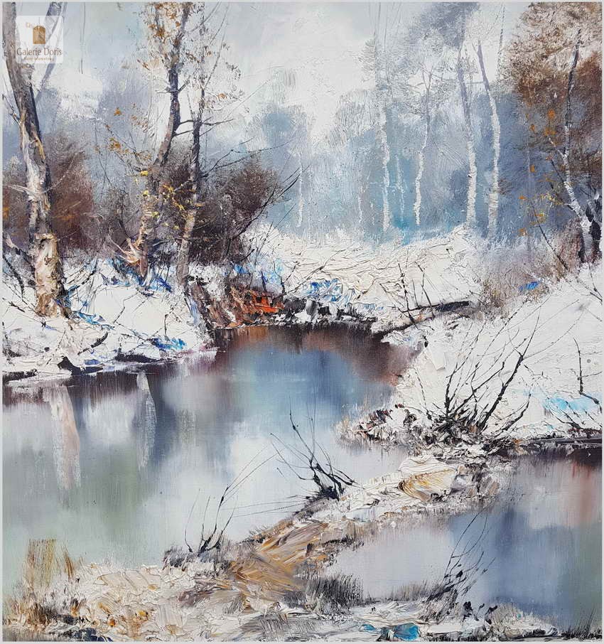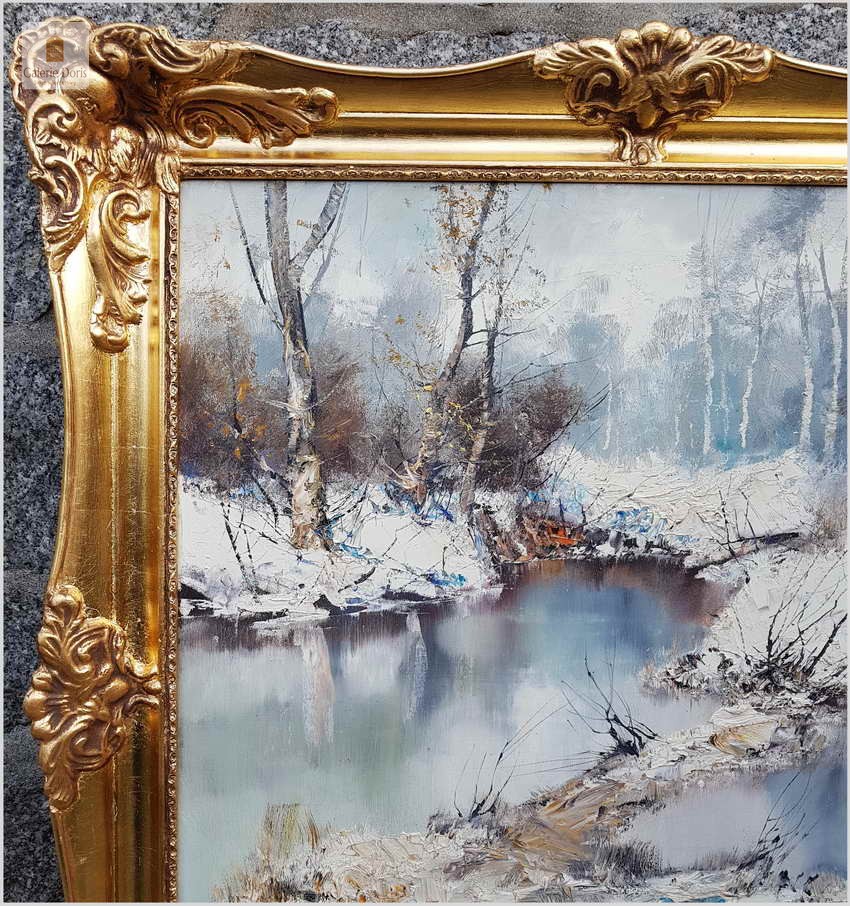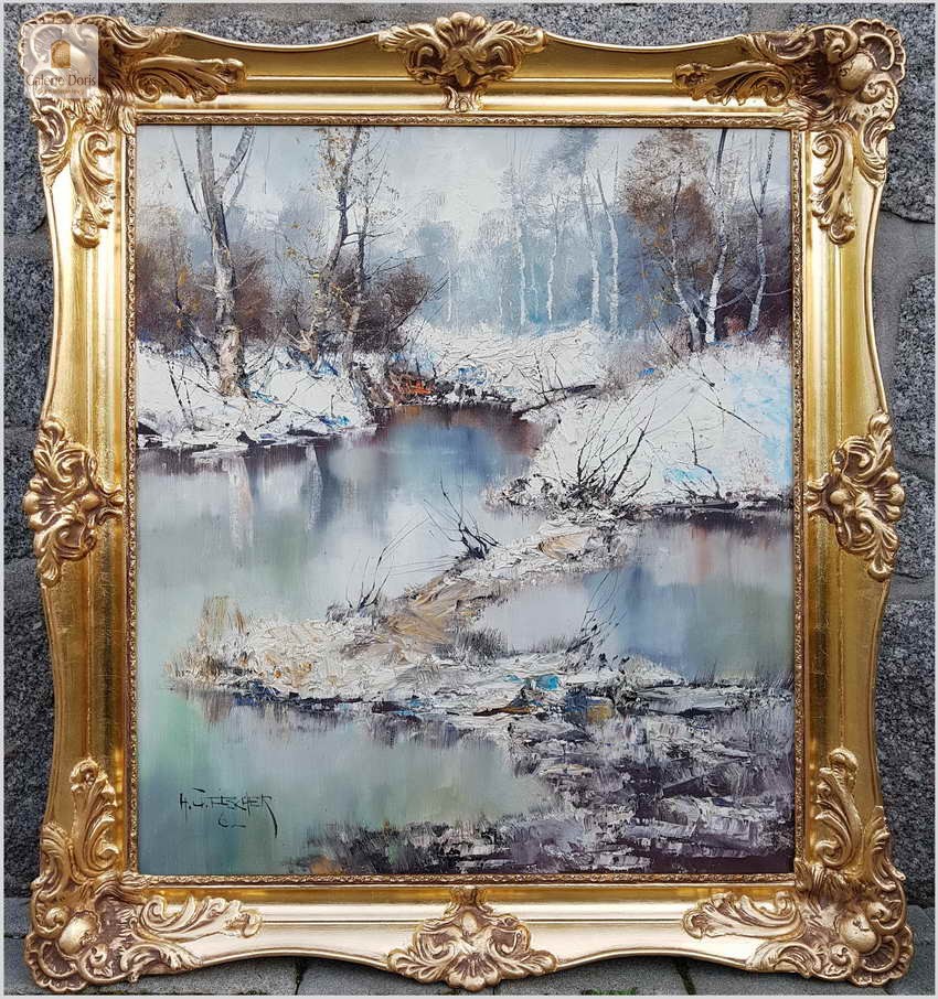 Prześliczny obraz olejny na na płótnie malowany w technice szpachlowej, ukazujący zimowy krajobraz leśny. Uwagę zwracają nagie konary drzew, śnieg i  woda. Wspaniała plastyczność krajobrazu podkreślona jest wysmakowanymi efektami światłocieniowymi oraz wyśmienitą grą niuansów kolorystycznych. Urzekająca paleta barw i świetna technika malarska cechują ten subtelnie malowany pejzaż