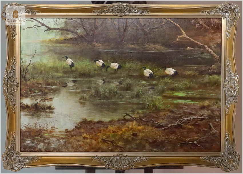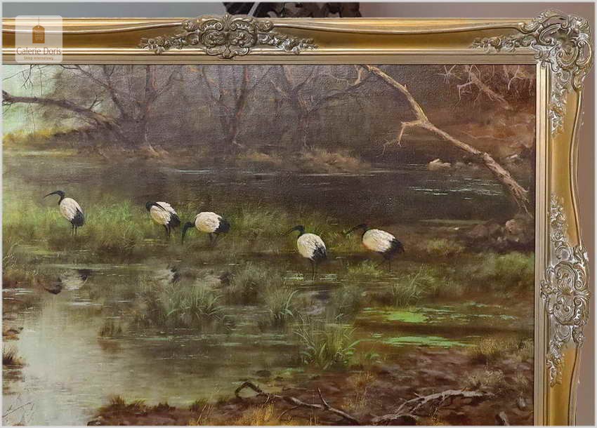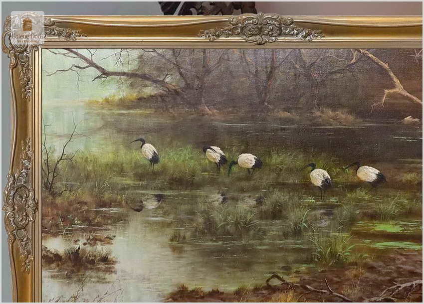 Przedstawiamy duży obraz olejny - Tanganika. Dzieło odznacza się dobrą perspektywą oraz wysmakowaną grą barw palety kolorystycznej. Obraz przedstawia Ibisy czarnopióre (Threskiornis molucca) – gatunek dużego ptaka z rodziny ibisów (Threskiornithidae). Zamieszkują Australię, Nową Gwineę, Wyspy Salomona, Małe Wyspy Sundajskie i Moluki. Nie jest zagrożony wyginięciem.