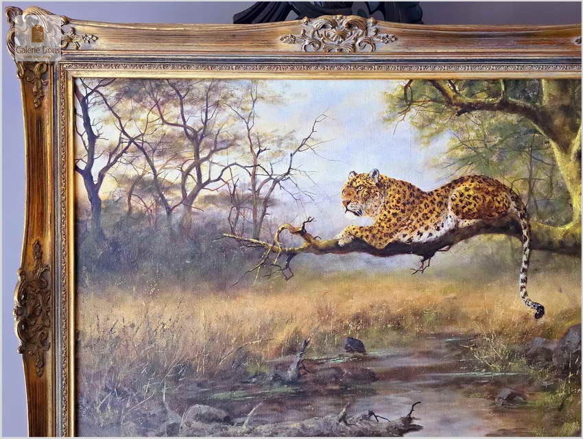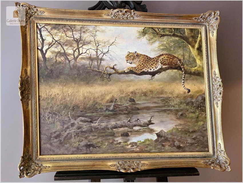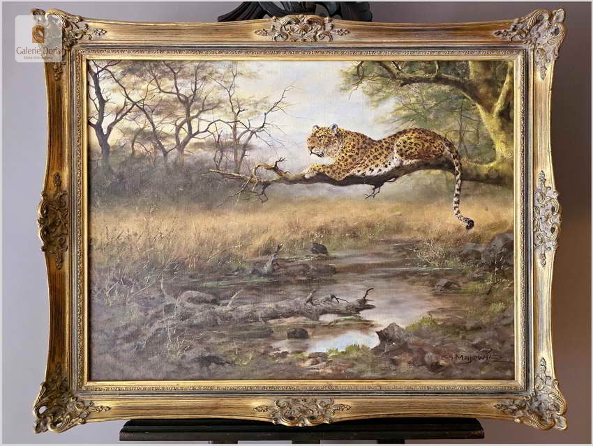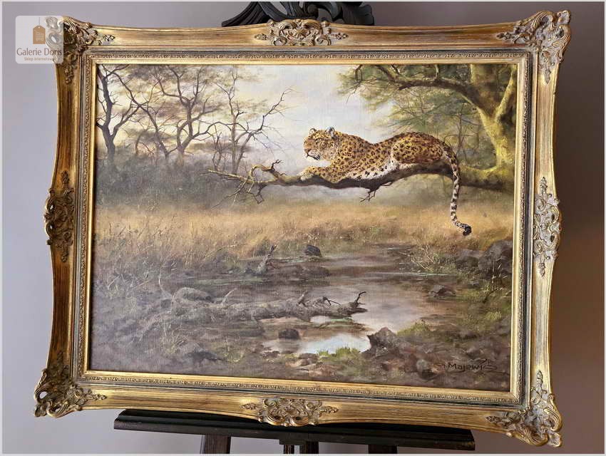 Obraz olejny autorstwa Majewicza przedstawia odpoczywającego lamparta na gałęzi drzewa. W tle widoczny jest krajobraz przypominający sawannę z rzadkimi drzewami i krzewami oraz małym strumieniem lub zbiornikiem wodnym na dole sceny. Obraz jest oprawiony w ozdobną złotą ramę z misternymi wzorami. Dzieło to jest interesujące, ponieważ przedstawia lamparta oraz naturalne piękno jego środowiska, z detalami pędzla i realistycznym kolorowaniem, co świadczy o umiejętnościach Majewicza w przedstawianiu scen z dzikiej przyrody. Obraz odznacza się dobrą perspektywą oraz wysmakowaną grą barw palety kolorystycznej. Jego obrazy cechują dobrą technikę malarską. Struktura farby wyraźnie wyczuwalna pod palcami. Malarz zdobył sobie już dosyć duże uznanie wśród koneserów na rynku malarstwa.