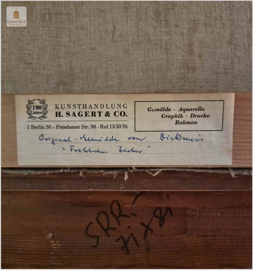 Biografia, (skrót) Gerhard Dickmeis (1918-1978): malarz niemiecki; studiował w Düsseldorfie. Malował pejzaże miejskie, portrety, martwe natury i przede wszystkim nie pozbawione humoru sceny rodzajowe o motywach i tematach chętnie podejmowanych przez wielu artystów.