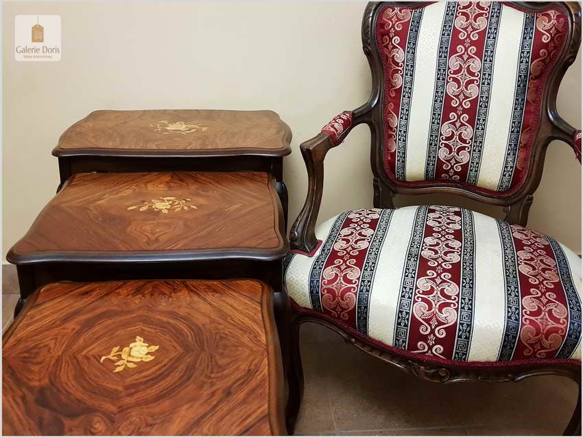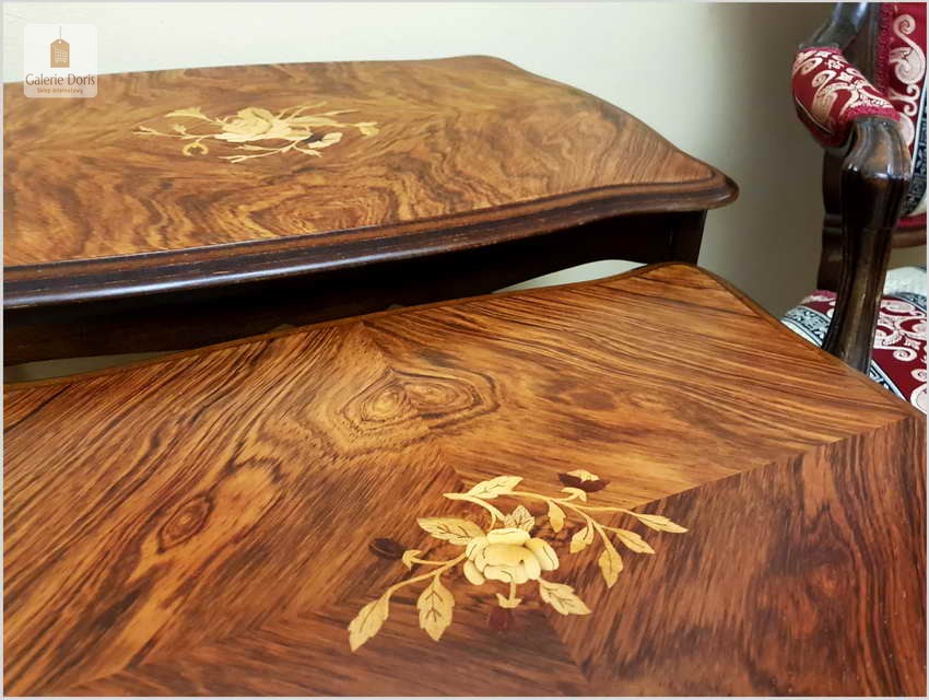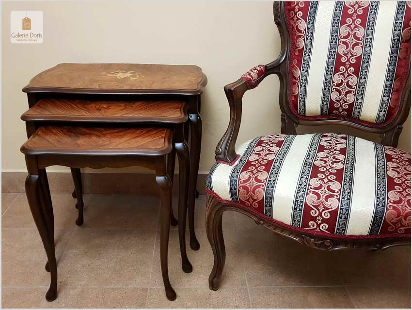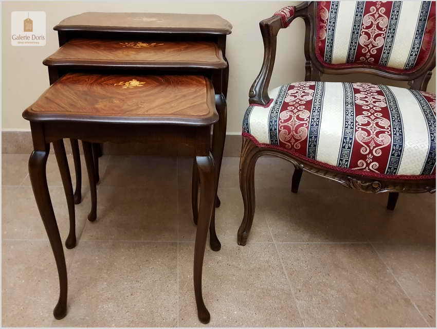 Wyjątkowy komplet trzech stolików Trojańskich (W tej cenie kupujesz 1 komplet = 3 sztuki), chowanych jeden w drugi w pięknym stylu Ludwika z intarsją . Stoliki przywiezione z Danii, proszę zwrócić uwagę na ich formę, zostały starannie odrestaurowane. Stoliki mogą służyć jako przenośne stoliczki kawowe zwłaszcza ten największy lub jako przepiękne uzupełnienie kącika kwiatowego.  Mebelki zostały wykonane w stylu Ludwika XV.