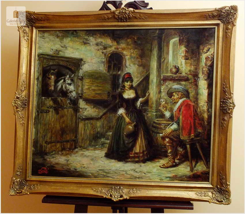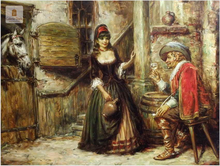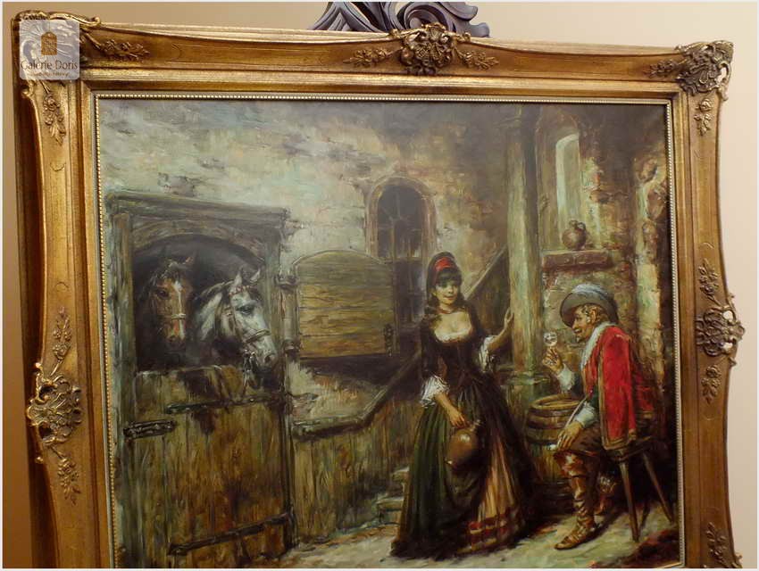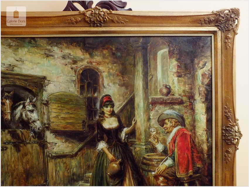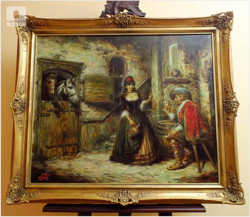 Polecamy stary obraz olejny pędzla znanego malarza niemieckiego Willi DePré. Zachwycająco oddał niesamowicie plastyczność malowanych postaci oraz ich otoczenia, całość podkreślona została finezyjnymi efektami światłocieniowymi a także wyśmienitą grą niuansów barwnych. Ten subtelnie malowany obraz cechuje znakomita technika malarska. Obraz bezpośrednio nawiązuje do dzieła XVII-wiecznego malarstwa. Oprawę malowidła stanowi przestrzenna, gruba rama wykonana z drewna. Złoconą ramę bogato dekorują kunsztowne sztukaterie. Obraz sygnowany jest w lewym dolnym rogu ramy. Gwarantujemy profesjonalnie zabezpieczoną przesyłkę kurierem.