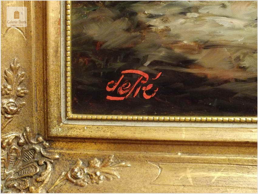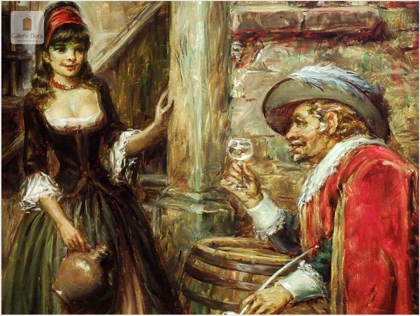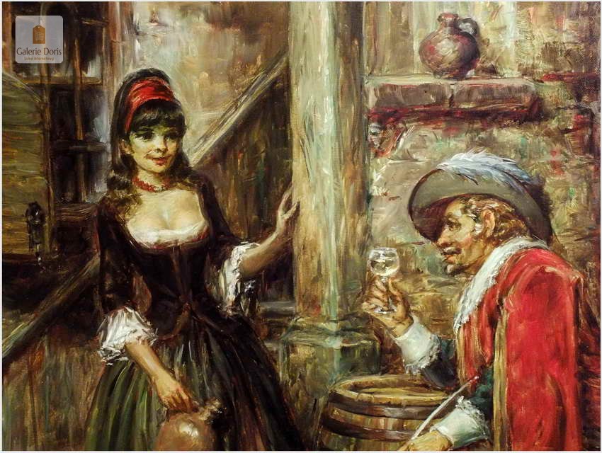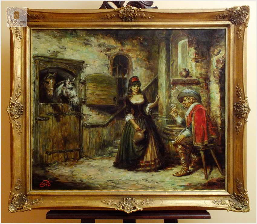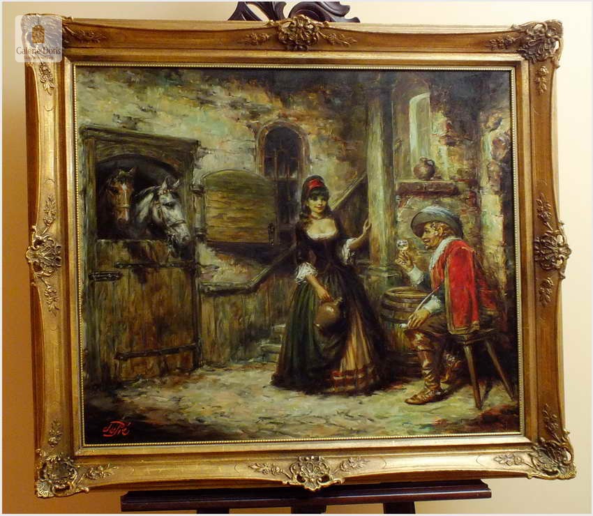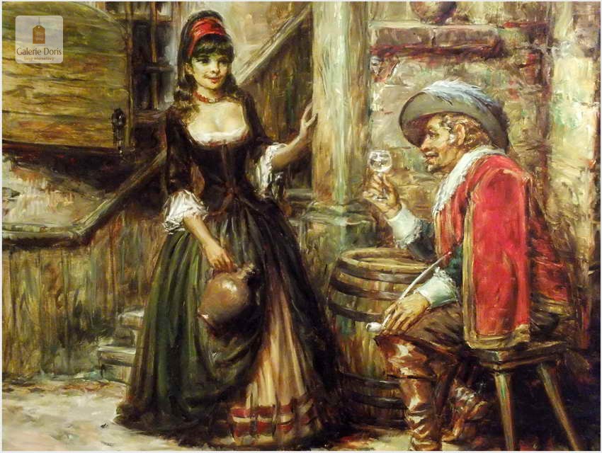 Polecamy stary obraz olejny pędzla znanego malarza niemieckiego Willi DePré. Zachwycająco oddał niesamowicie plastyczność malowanych postaci oraz ich otoczenia, całość podkreślona została finezyjnymi efektami światłocieniowymi a także wyśmienitą grą niuansów barwnych. Ten subtelnie malowany obraz cechuje znakomita technika malarska. Obraz bezpośrednio nawiązuje do dzieła XVII-wiecznego malarstwa. Oprawę malowidła stanowi przestrzenna, gruba rama wykonana z drewna. Złoconą ramę bogato dekorują kunsztowne sztukaterie. Obraz sygnowany jest w lewym dolnym rogu ramy. Gwarantujemy profesjonalnie zabezpieczoną przesyłkę kurierem.
