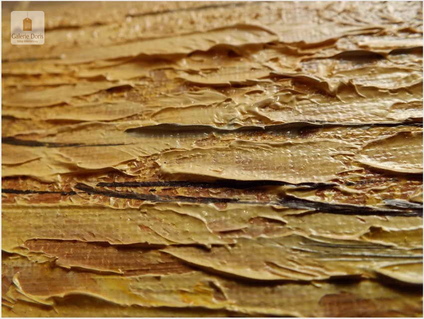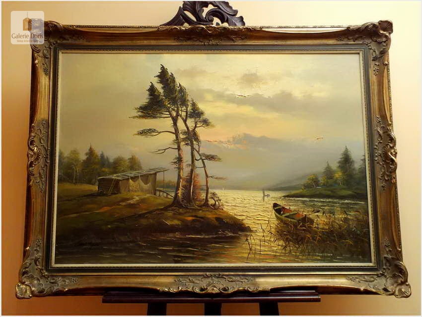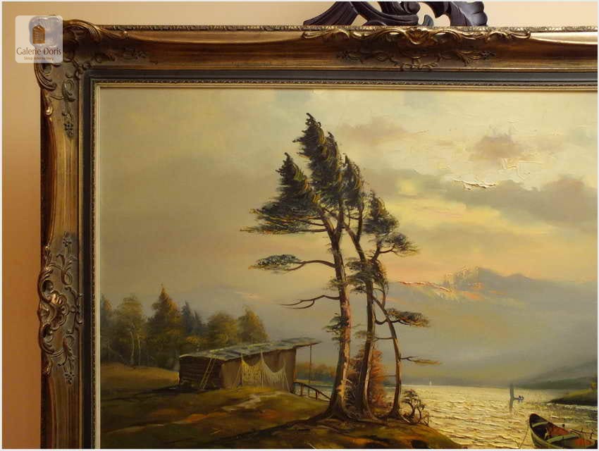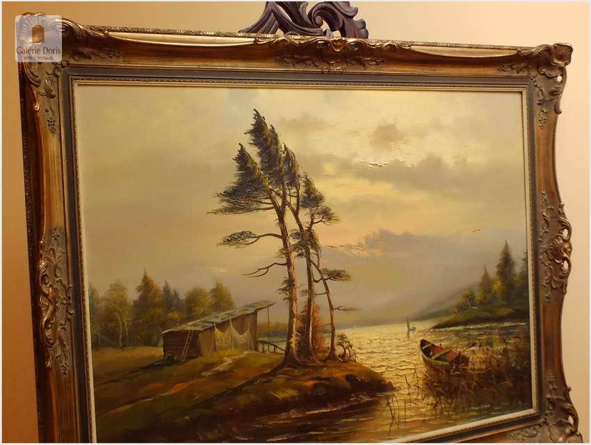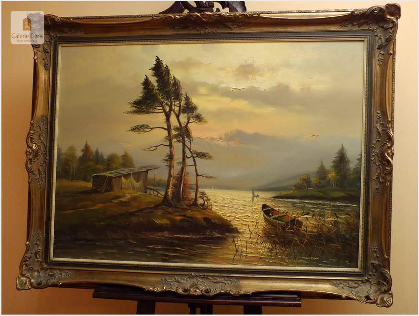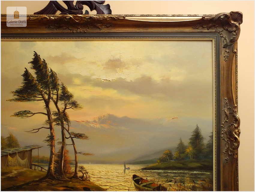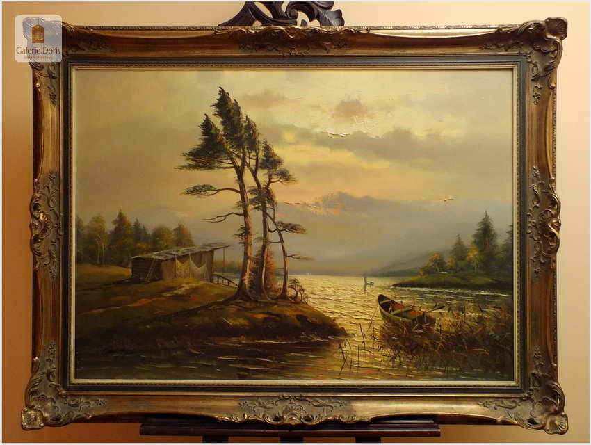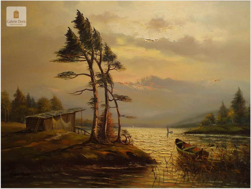 Przedstawiamy duży obraz olejny. Po zmroku i zapaleniu światła w pomieszczeniu, wydobywa się z płótna głębia tworząc piękne światłocieniowe impasty. Obraz urzeka szczególną dekoracyjnością, bardzo dobrą kompozycją, łagodnym nastrojem . Obraz malowany farbami olejnymi na płótnie, struktura nałożonej farby mocno wyczuwalna jest pod palcami.  Dzieło polecamy koneserom cennego i dobrego malarstwa pejzażowego.
