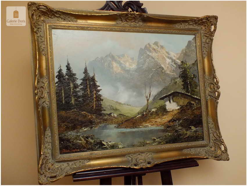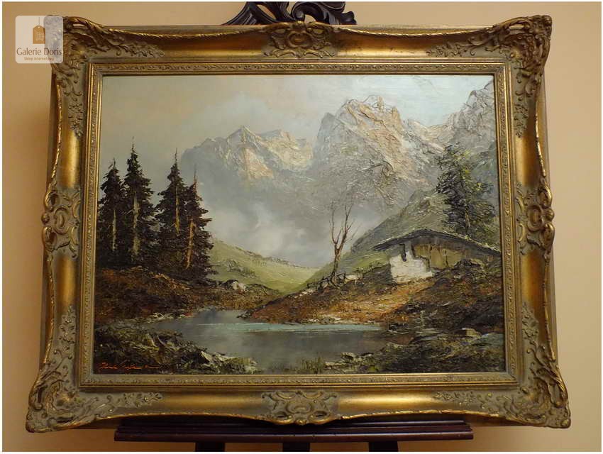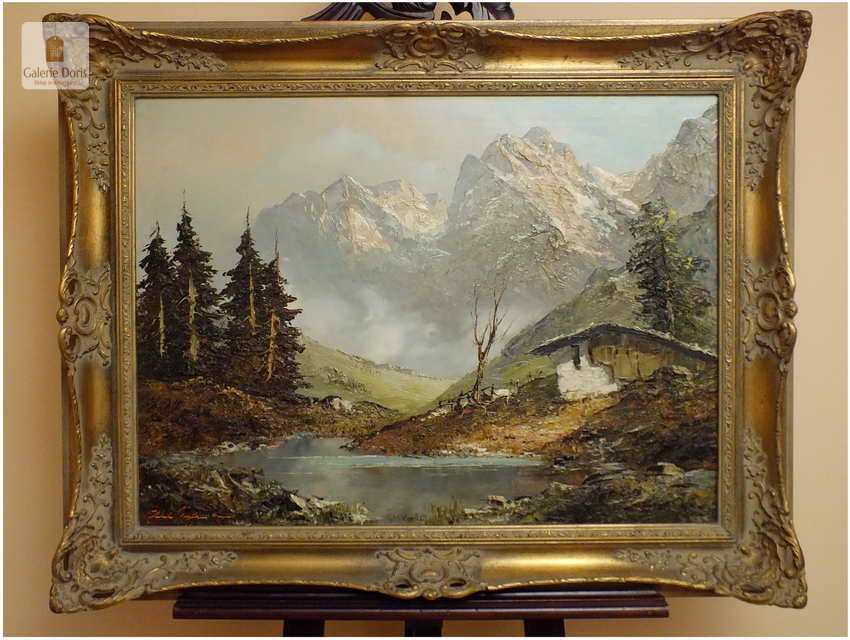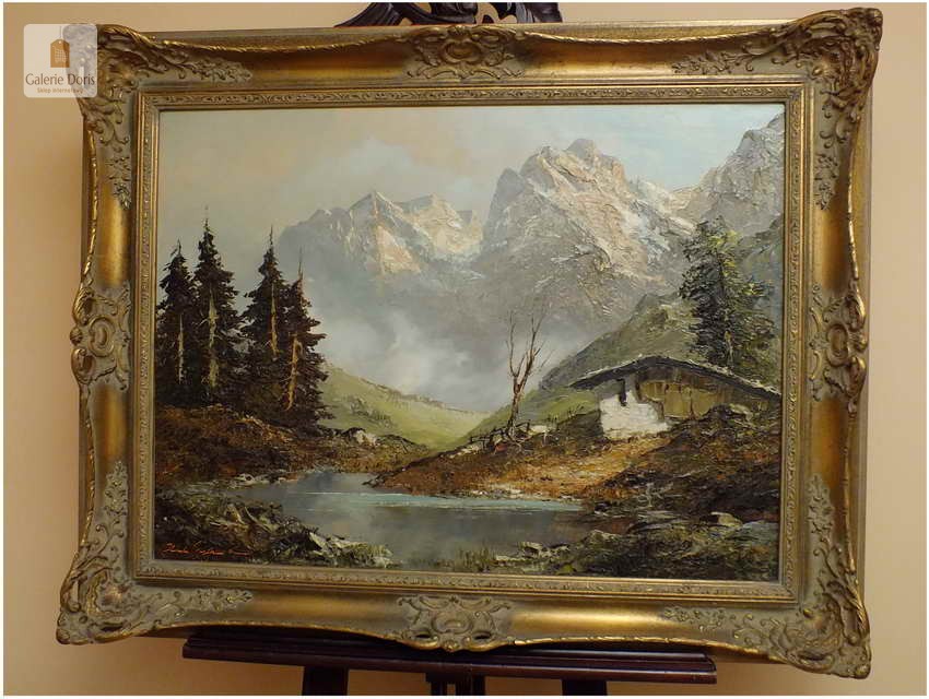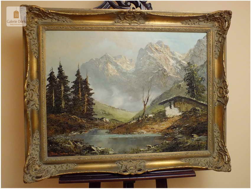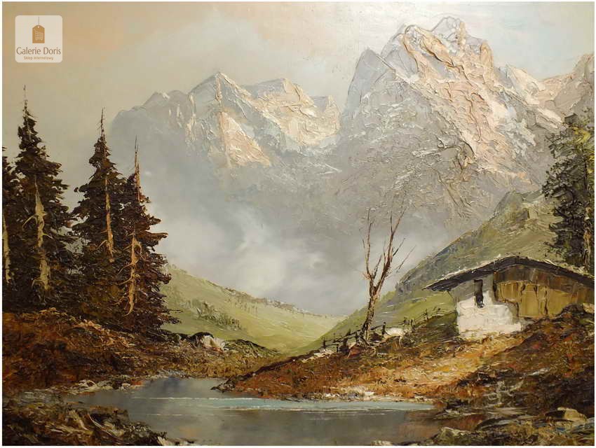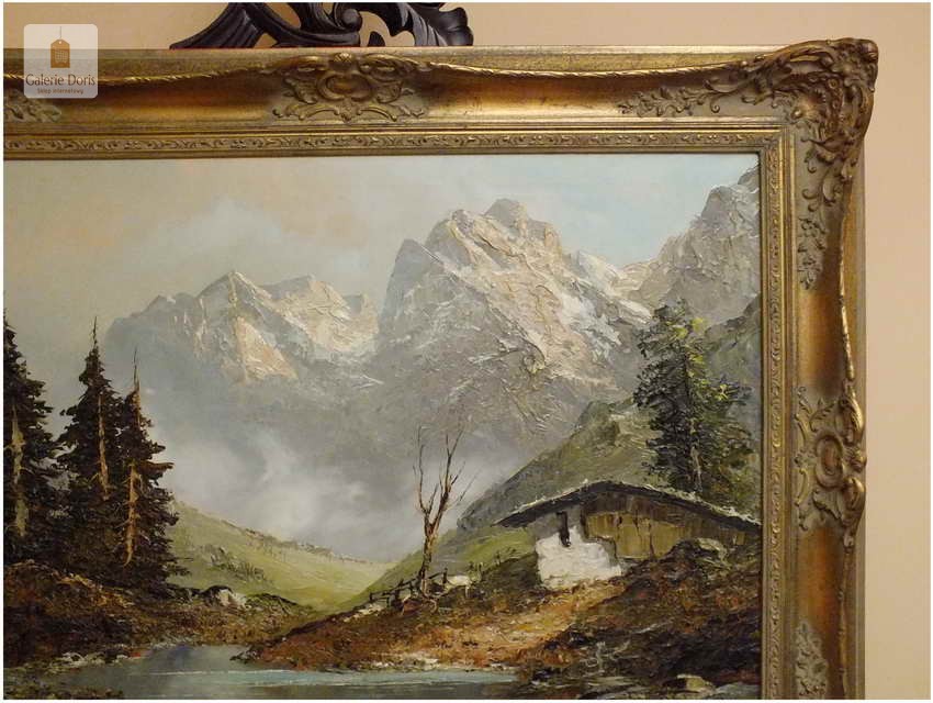 Polecamy obraz malowany techniką szpachlową olejem na płótnie znanego malarza niemieckiego Herberta Uerpmanna, obraz sygnowany w dolnym rogu. Po jakości i ruchach pędzla widać kunszt i profesjonalizm dzieła. Urodził się w Wuppertal-Bremen studiował w szkole artystycznej Barmen Wiethüchter u profesorów: Gustav i Ludwig Fahrenkrog, wiele wyjazdów studyjnych w całej Europie, Wielokrotnie katalogowany i wymieniony w odpowiednich prestiżowych katalogach o malarstwie. Malarz na obrazie ukazuje swoją fascynację do krajobrazów alpejskich. Wyraża to naturalnym kolorem, światłem oraz wirtuozerią szpachli i pędzla. Polecamy!
