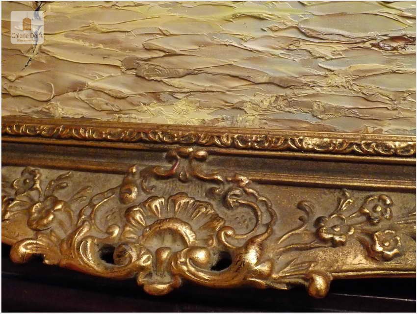 Przedstawiamy duży obraz olejny. Po zmroku i zapaleniu światła w pomieszczeniu, wydobywa się z płótna głębia tworząc piękne światłocieniowe impasty. Obraz urzeka szczególną dekoracyjnością, bardzo dobrą kompozycją, łagodnym nastrojem . Obraz malowany farbami olejnymi na płótnie, struktura nałożonej farby mocno wyczuwalna jest pod palcami.  Dzieło polecamy koneserom cennego i dobrego malarstwa pejzażowego.