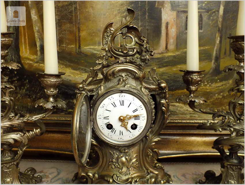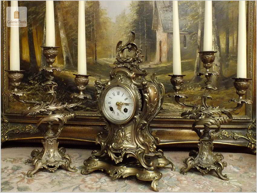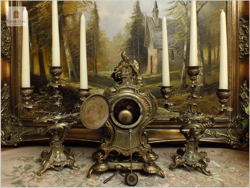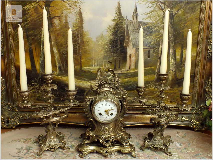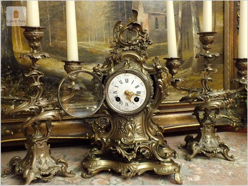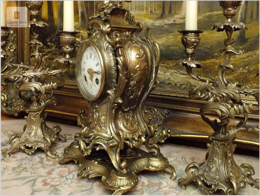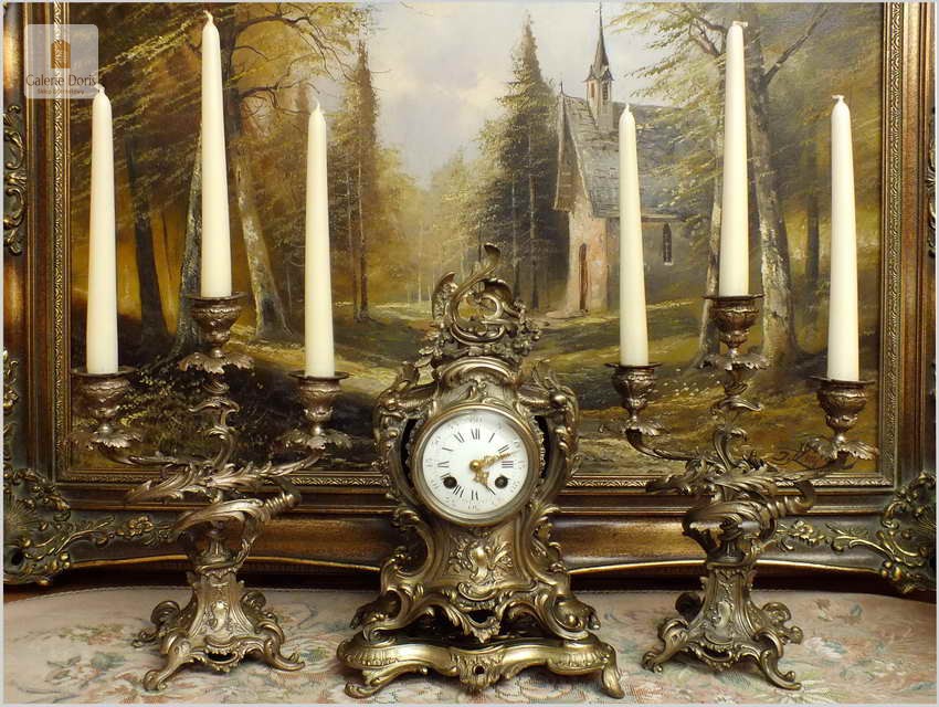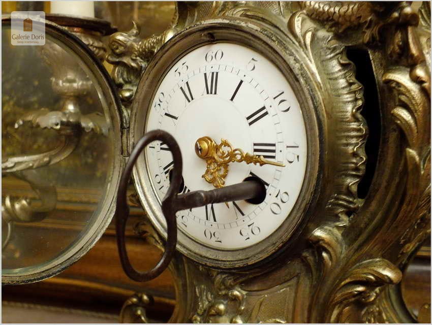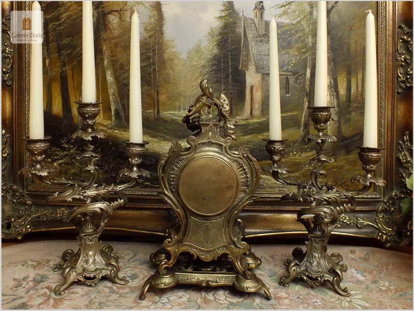 WYJĄTKOWY KOMPLET MOSIĘŻNY, ZEGAR ZE ŚWIECZNIKAMI - ROCOCO 1878 ROK