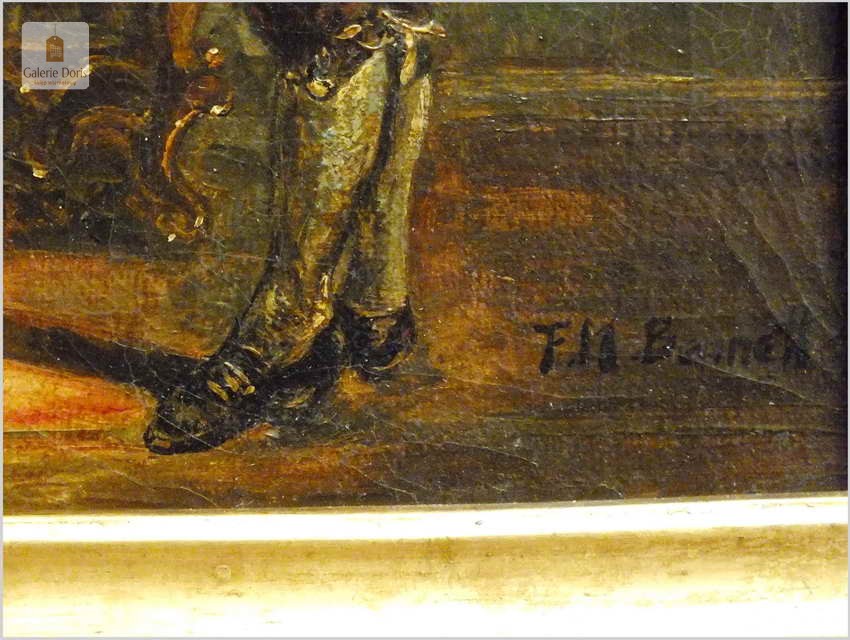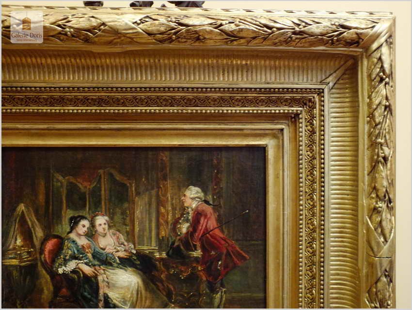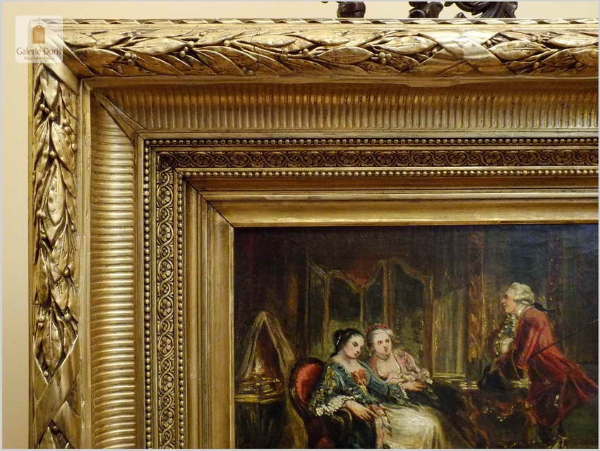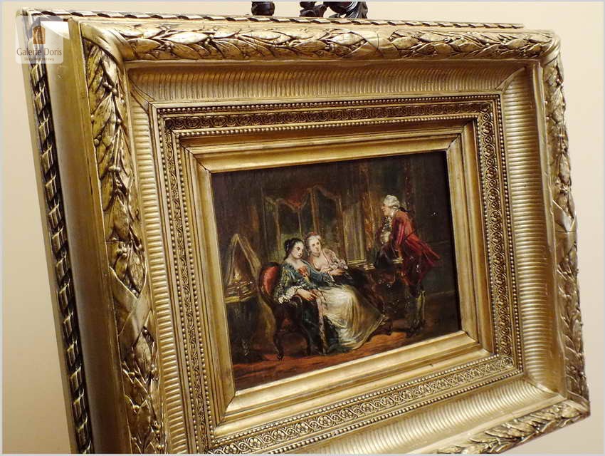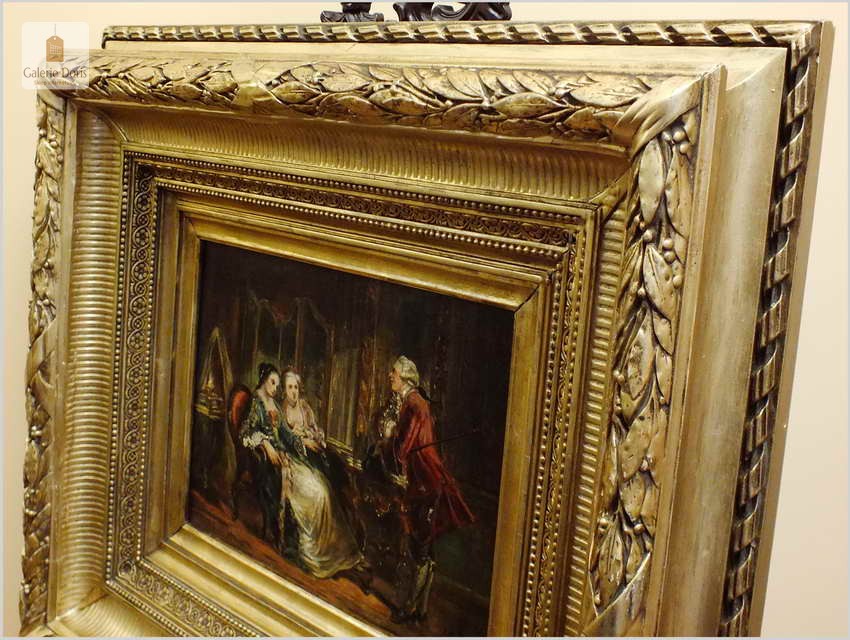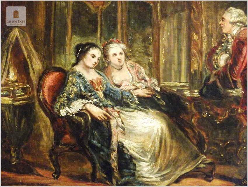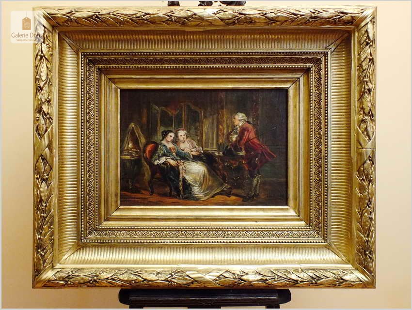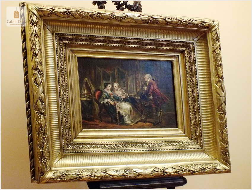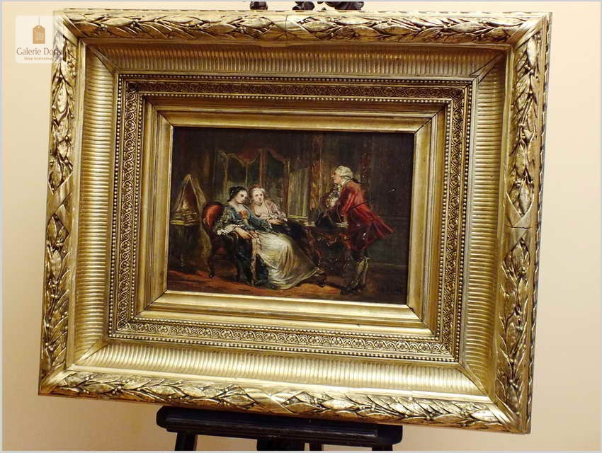 Wspaniały stary obraz olejny na płótnie, scenka rodzajowa na tle buduaru w stylu Pompadour, jest zgodna z panującą modą w epoce rokoko. Artysta posłużył się subtelną kolorystyką oraz miękkimi i falistymi liniami. Obraz bez uszkodzeń sygnowany w prawym dole podpisem autorskim malarza. Polecamy!