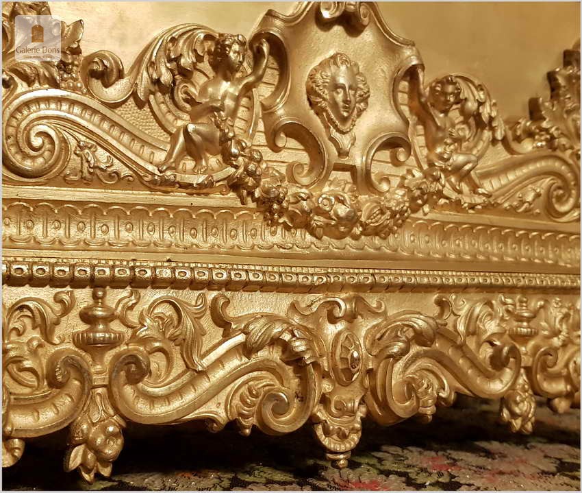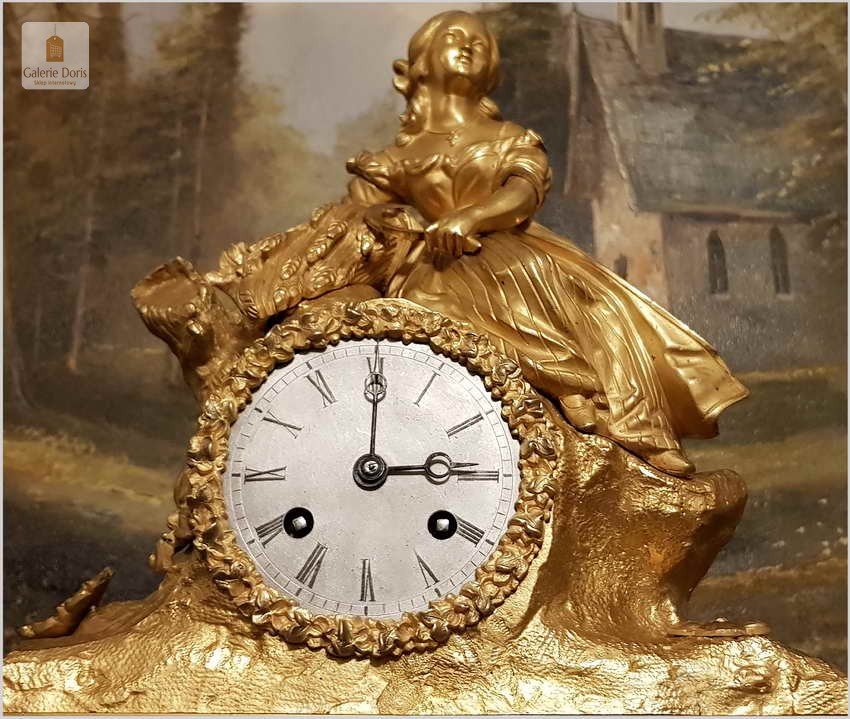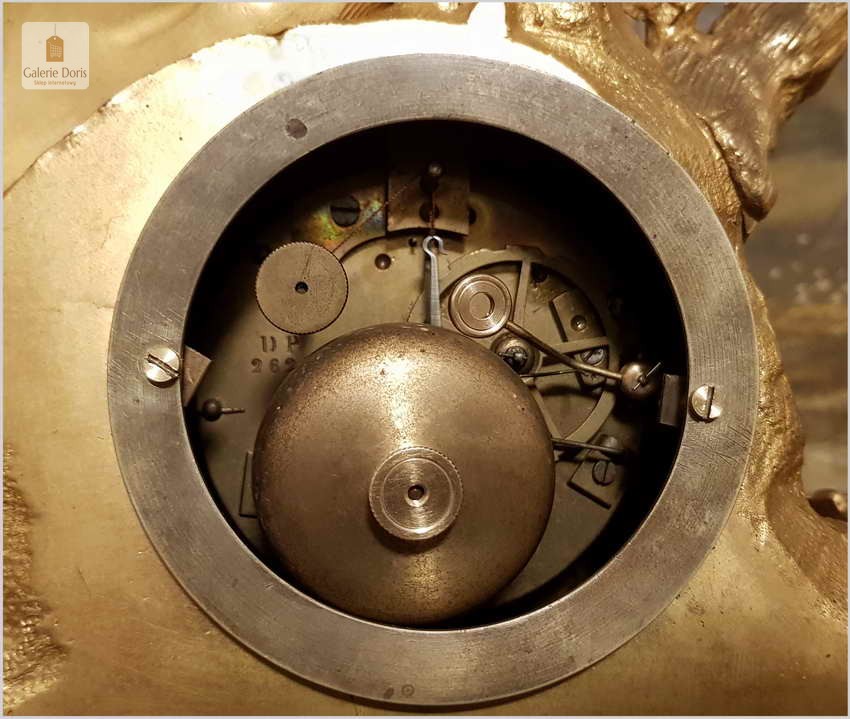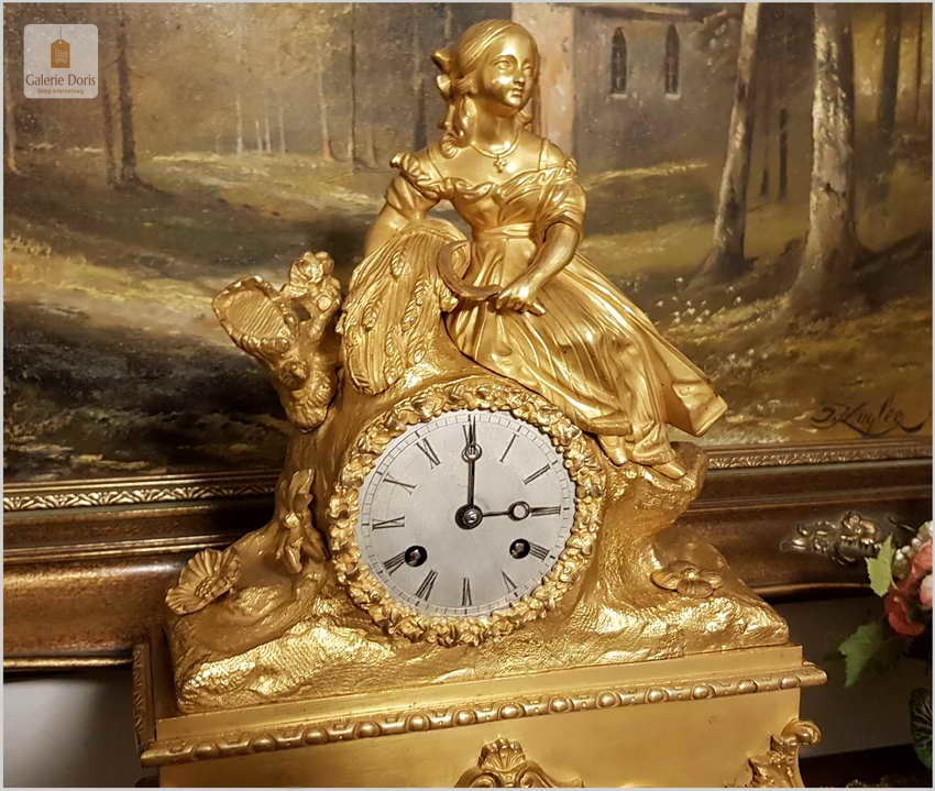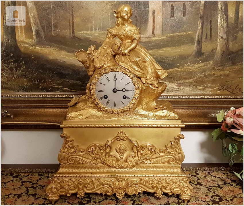 Przedmiotem naszej oferty jest niezwykle piękny złocony pałacowy zegar kominkowy. Dekoracje zegara zostały wykonany z brązu złoconego ogniowo. Zegar jest pięknie zdobiony, zarówno obudowa mechanizmu, pełna barokowych i secesyjnych elementów, góra zegara zakończona figurą kobiety. Figura została wykonana z wielką dbałością o szczegóły. Mechanizm półgodzinny, gong dzwonkowy wybija połówki i pełne godziny, w komplecie klucz do nakręcania.