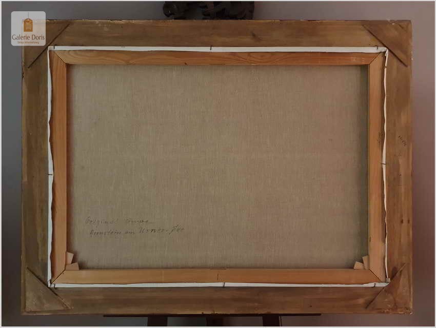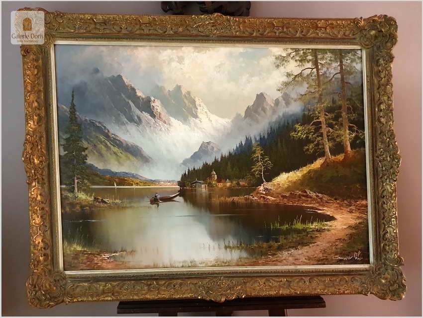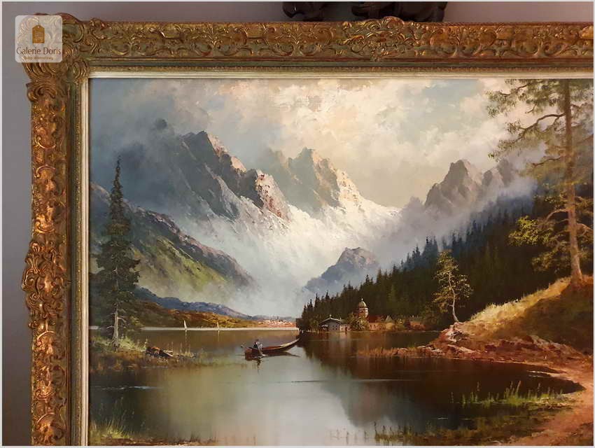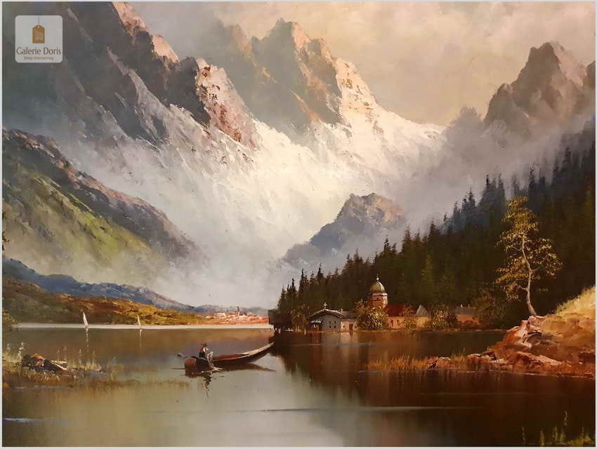 Polecamy duży wyjątkowo dekoracyjny obraz olejny na płótnie. Romantyczny krajobraz, przedstawia malowniczy krajobraz z nad jeziora Urner See. Subtelnie malowany duży obraz olejny na płótnie. Wspaniale oddano partię nieba oraz rozległy widok na otaczające go góry. Bardzo dobra i nastrojowa kompozycja.
