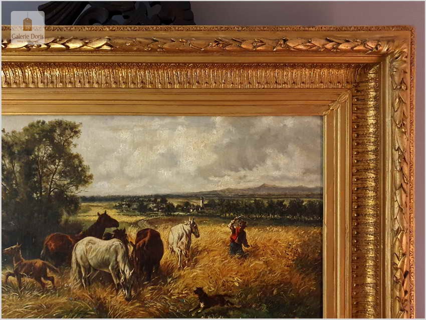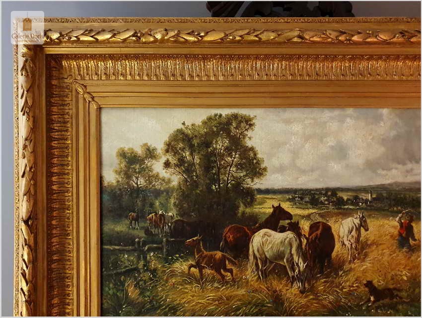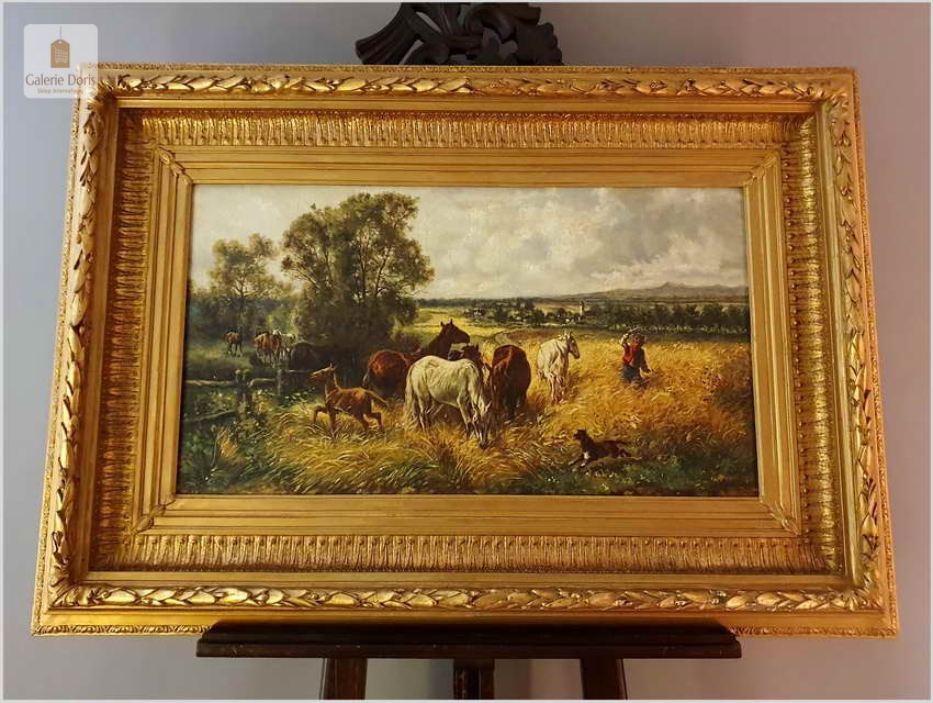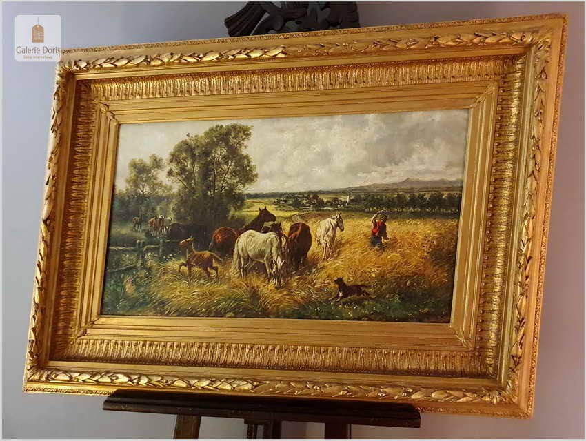 Polecamy stary obraz olejny o tematyce animalistycznej. Całość dzieła podkreślona została subtelnie malowany ruchem pędzla. Oprawę malowidła stanowi przestrzenna, gruba rama wykonana z drewna. Złoconą ramę bogato dekorują kunsztowne sztukaterie. Obraz sygnowany jest w prawym dolnym rogu ramy.