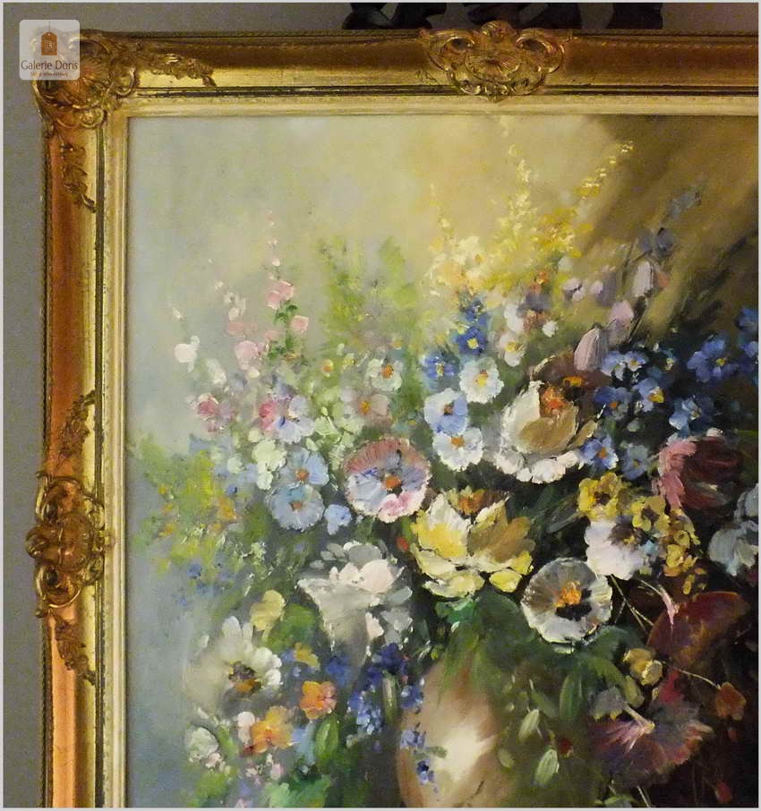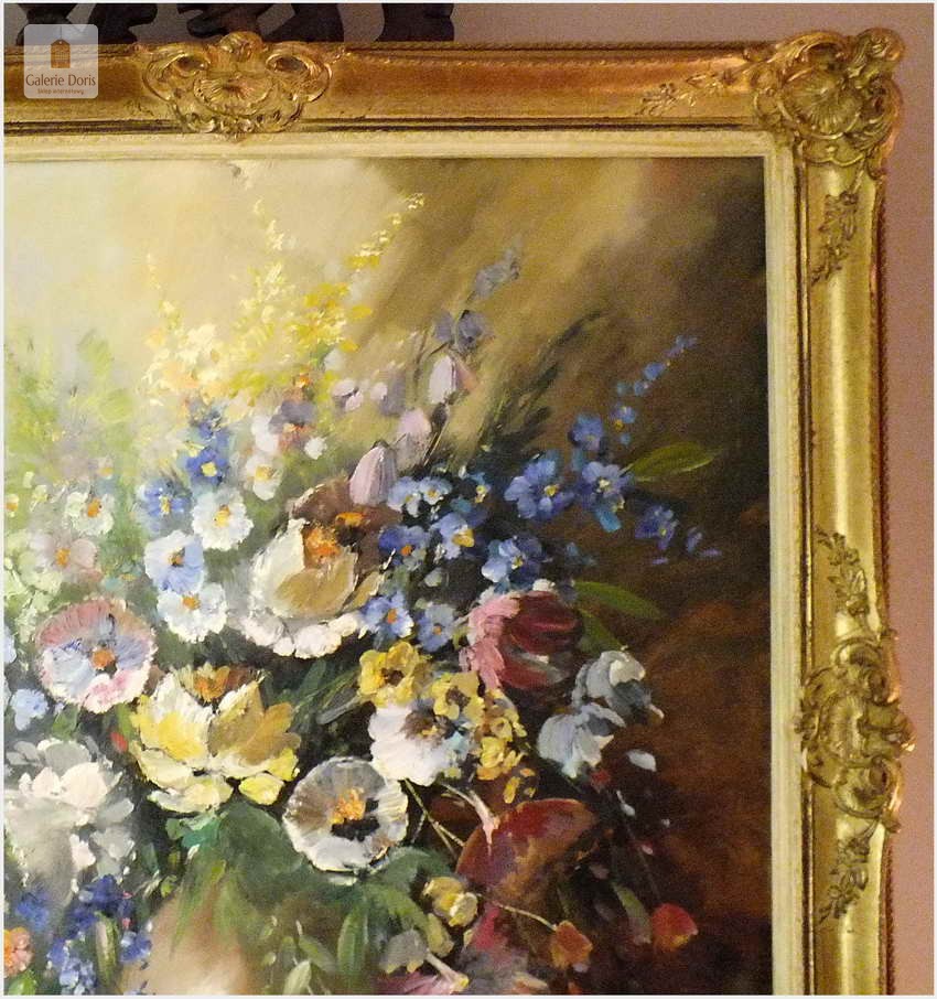 Wyjątkowe kwiaty, stary obraz olejny malowany na płótnie. Niezwykle piękna, klasyczna martwa natura, która ukazuje zachwycające polne kwiaty w pękatym wazonie. Wyśmienita paleta kolorystyczna oraz znakomite, finezyjne światłocienie niebywale sugestywnie oddają żywotność roślin. Obraz cechuje świetna technika malarska, struktura farby wyczuwalna pod palcami. Powierzchnię malatury pokrywa warstwa werniksu.