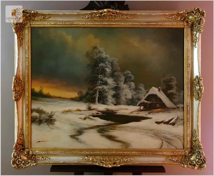 Jego styl malarski wyróżnia się przede wszystkim zastosowaniem tematyki romantycznej, ciepłych subtelnie oddanych kolorów. Jego prace często są spotykane na europejskich aukcjach. Ten obraz jest jego bardzo dobrą pracą z późniejszych lat jego twórczości. Piękną dodatkową ozdobą jest bardzo bogata rama o konstrukcji drewnianej.
