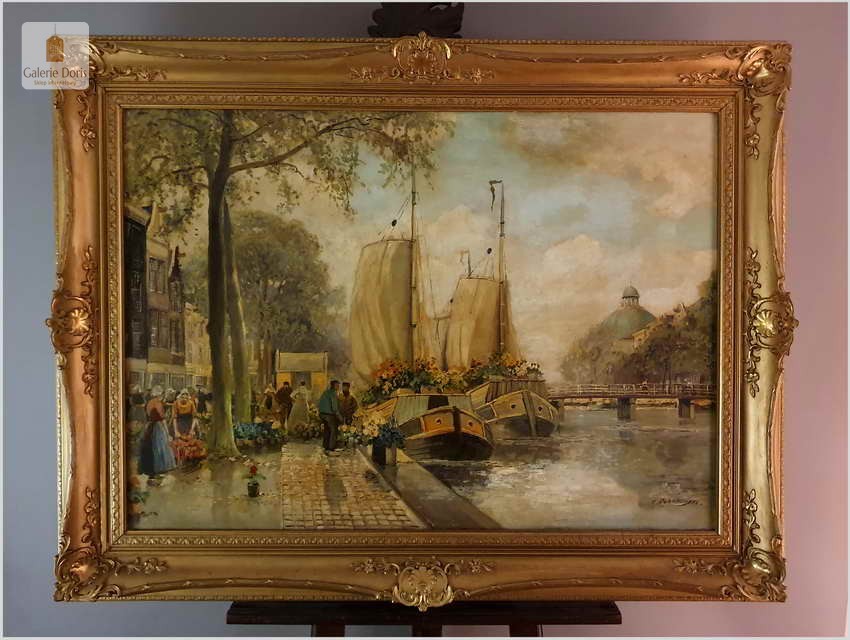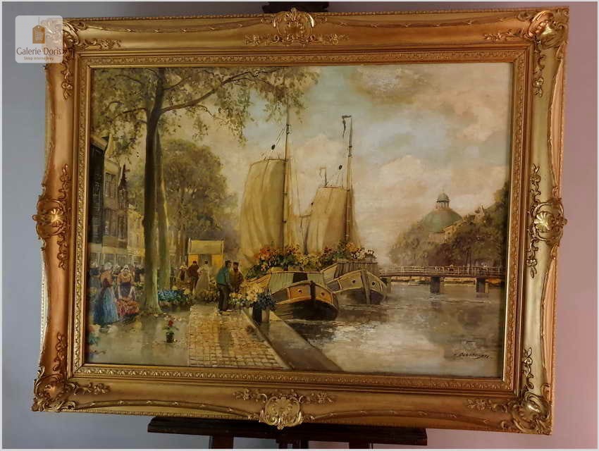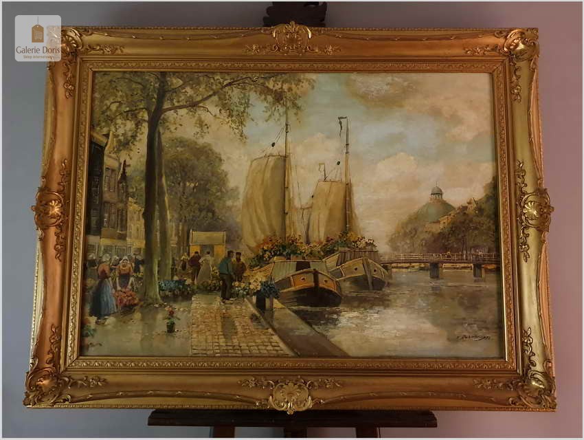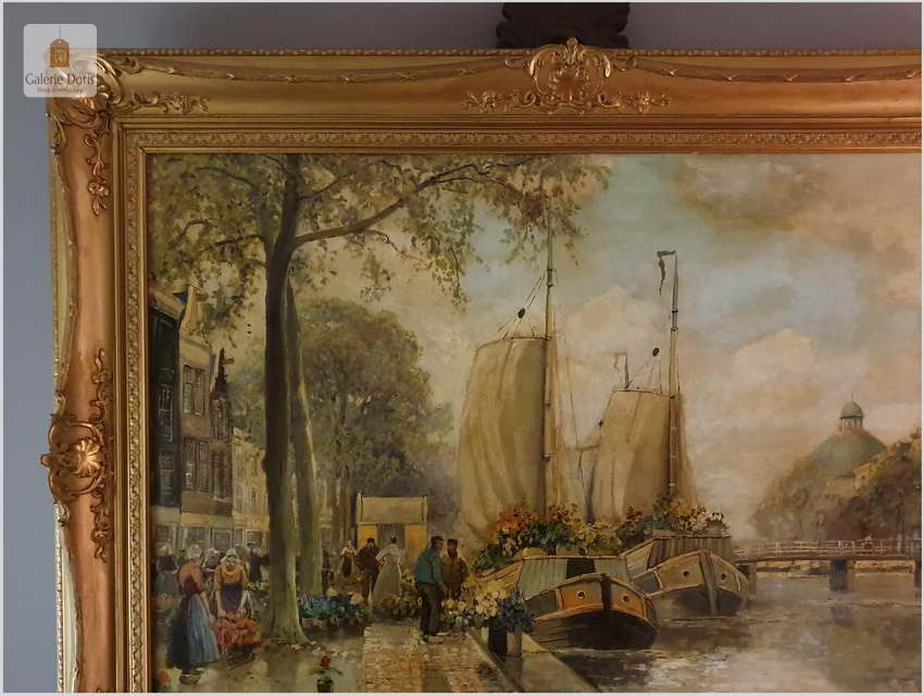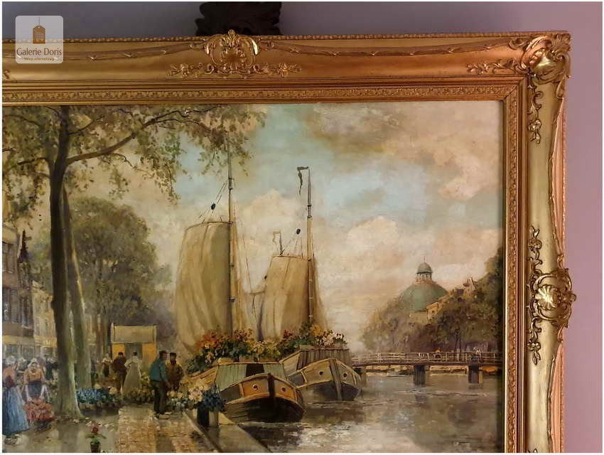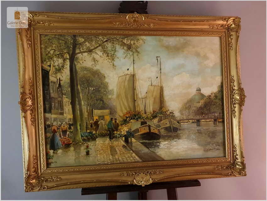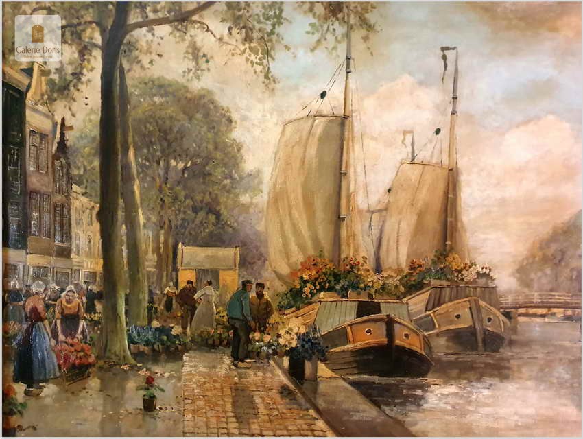 Polecamy oryginalny duży obraz olejny, niezwykle dekoracyjny, profesjonalnie namalowany. Prace malarza spotkamy sygnowane imieniem i nazwiskiem lub dwuczłonowo Hans Richter-Johansenn. Obraz olejny przedstawia najbardziej ulubiony temat artysty, jest nim oczywiście targ kwiatowy.
