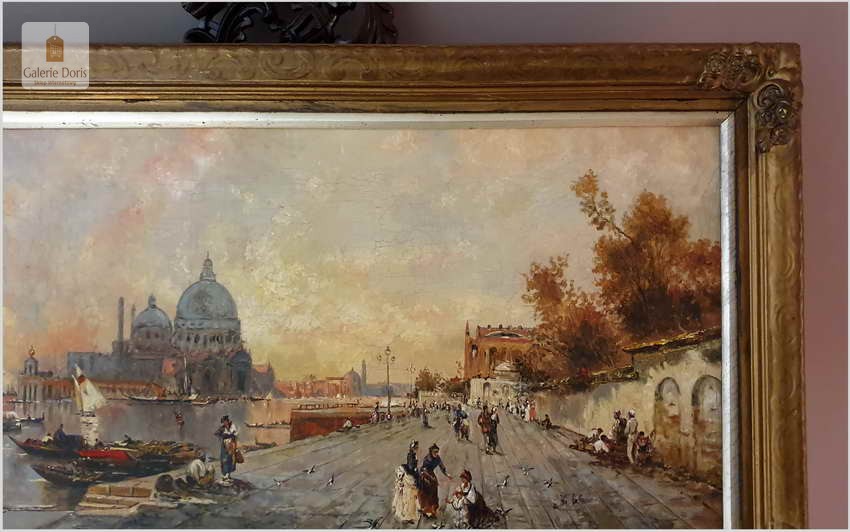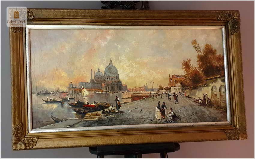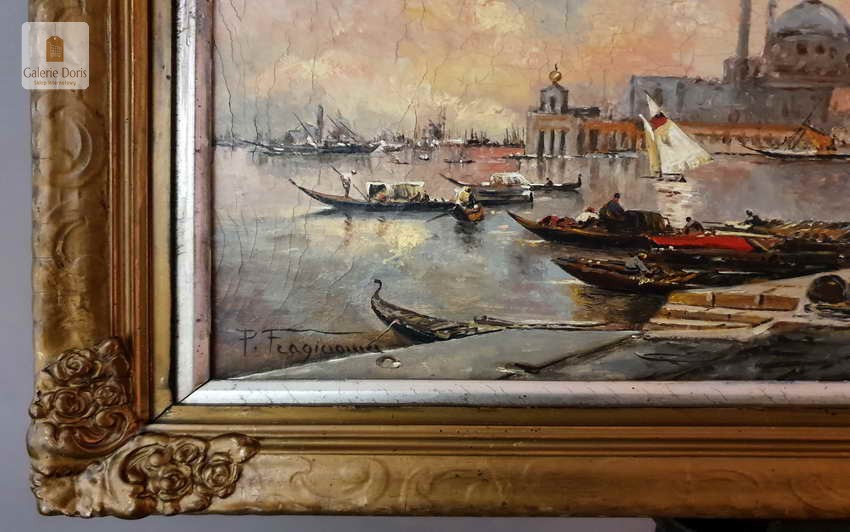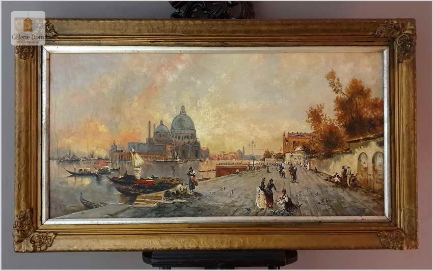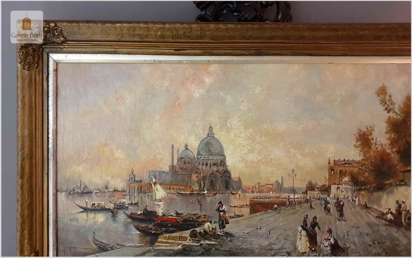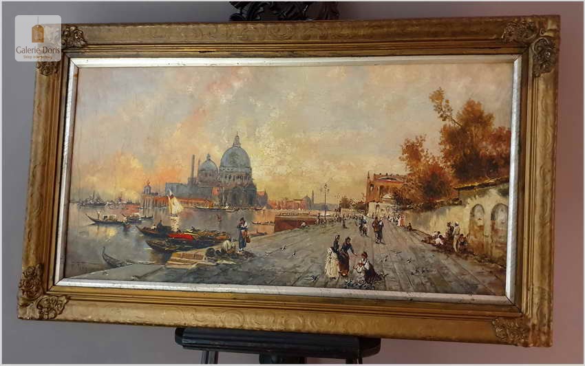 Zachwycający olejny obraz malowany na płótnie, posiada widoczną klakelurę. Przedstawia widok na Punta della Dogana i Santa Maria della Salute. Uwagę przykuwają liczne mniejsze i większe łódki. Cechuje go znakomita technika malarska. Oprawę malowidła stanowi przestrzenna rama wykonana z drewna.