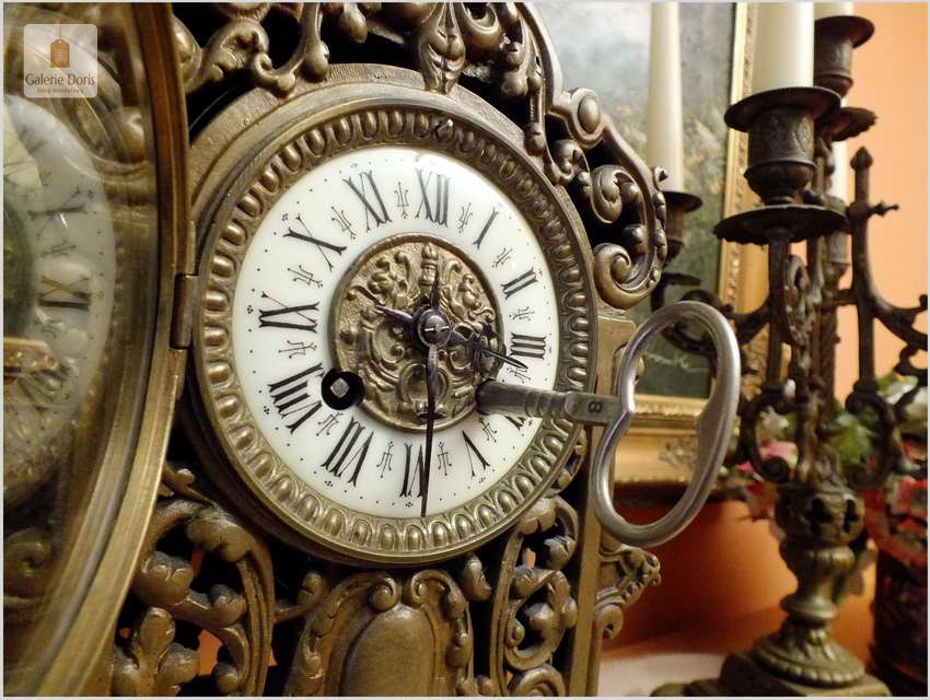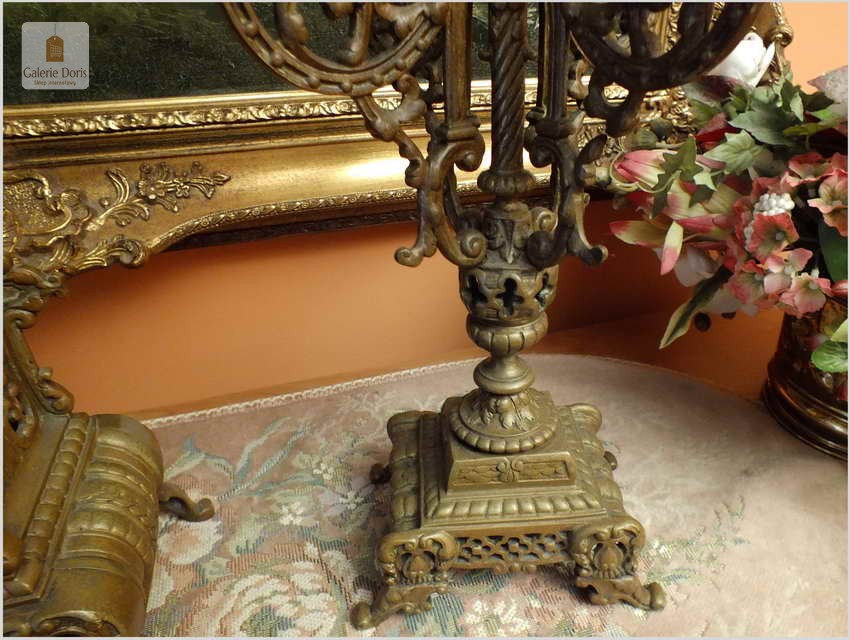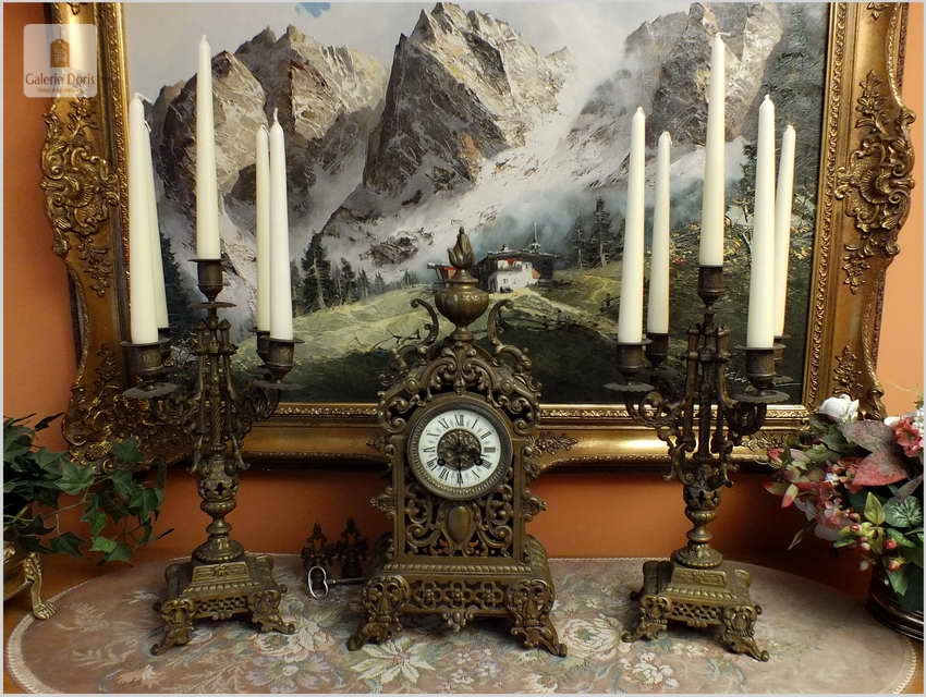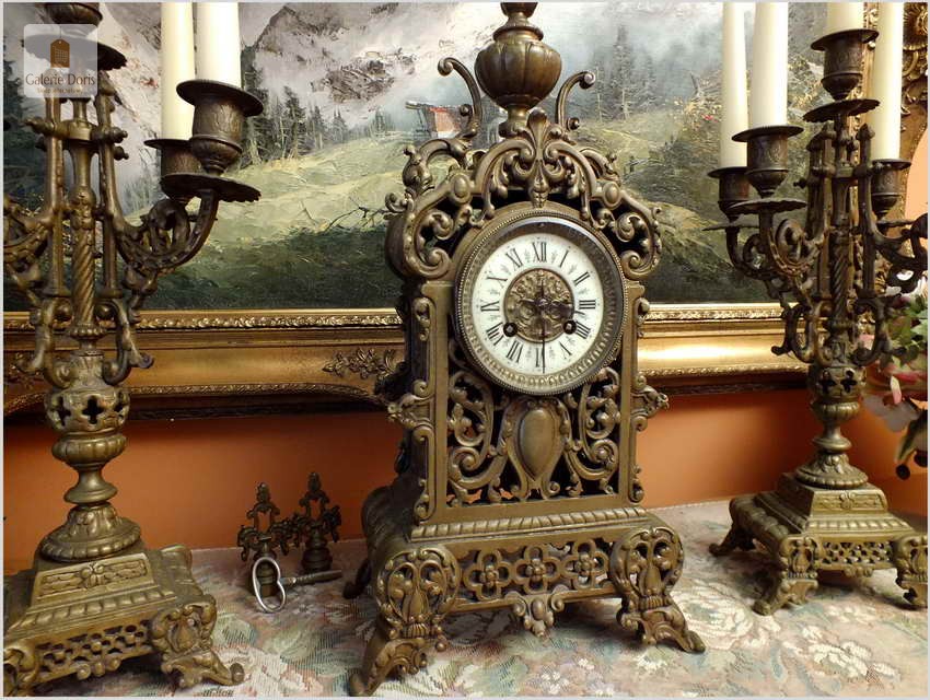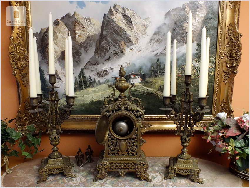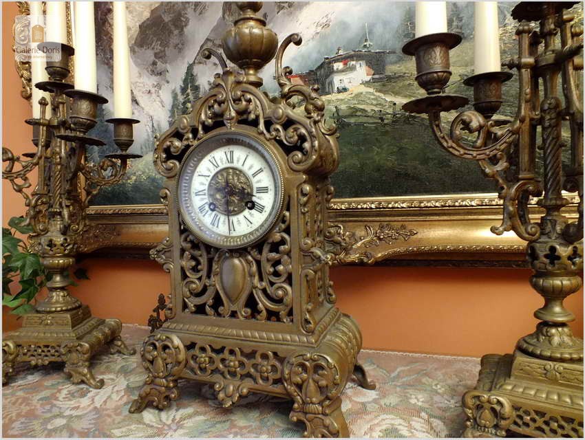 Przedmiotem oferty jest wspaniały, stary francuski garnitur kominkowy. W skład kompletu wchodzą: Zegar i dwa kandelabry z gasidłami na pięć świec każdy. Głównym atrybutem dekoracyjnym zegara jest ażurowa forma. Mechanizm półgodzinny wybija pełne godziny oraz połowy. Polecamy!