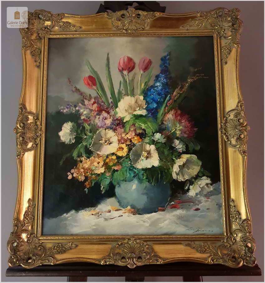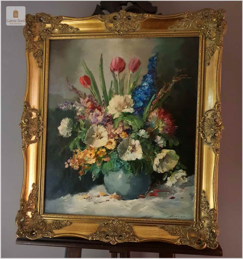 Obraz olejny na płótnie, osadzony w  stylowej złoconej ramie. Malarz przedstawił nam martwą naturę - Bukiet kwiatów w wazonie. Zastosowana technika malarska to pędzel i szpachla. Niezwykle dekoracyjny nastrojowy obraz idealna dekoracja salonu.